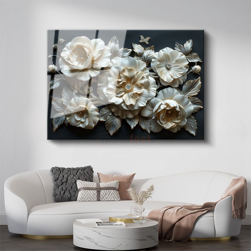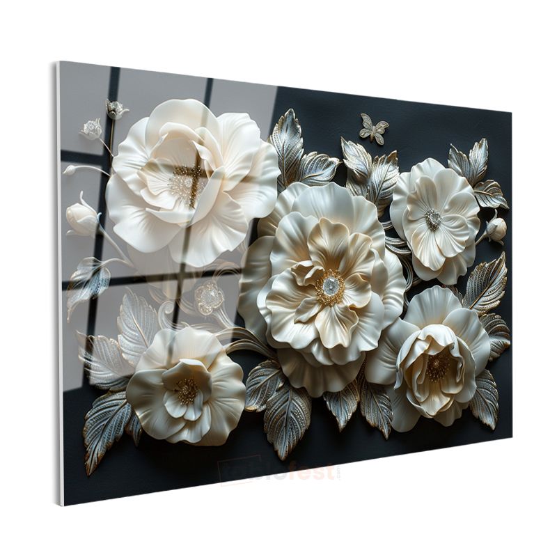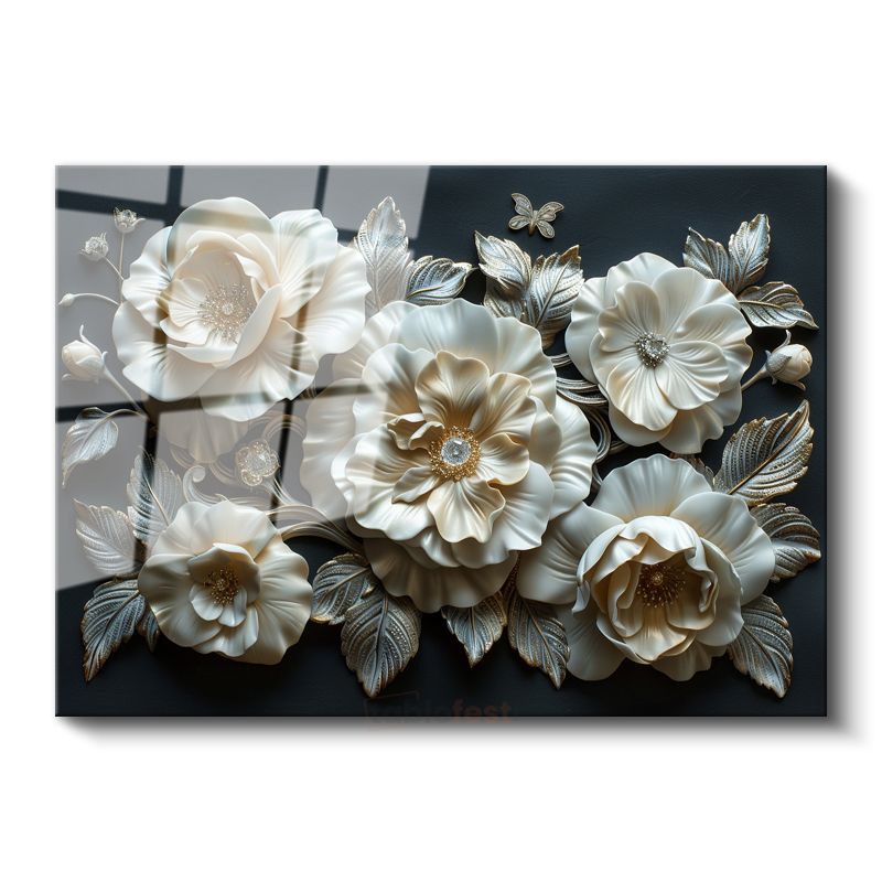 Krem Çiçekler - Siyah Fonda Gümüş Yapraklı Dekoratif Cam Tablo