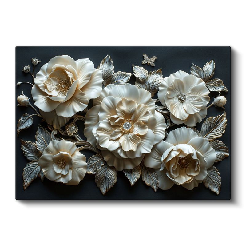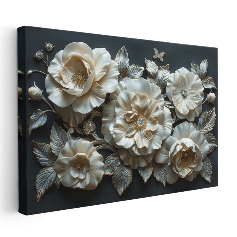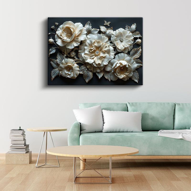 Krem Çiçekler - Siyah Fonda Gümüş Yapraklı Dekoratif Kanvas Tablo