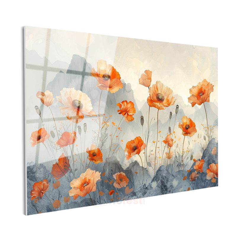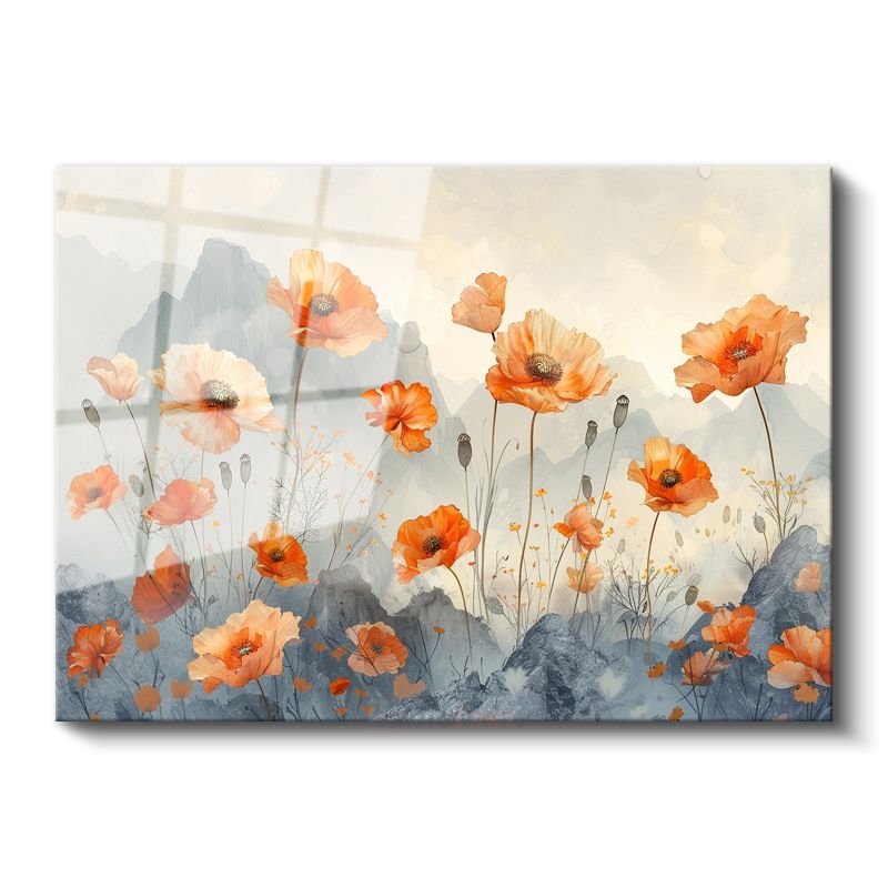Krem Çiçekler - Siyah Fonda Minimalist Botanik Cam Tablo