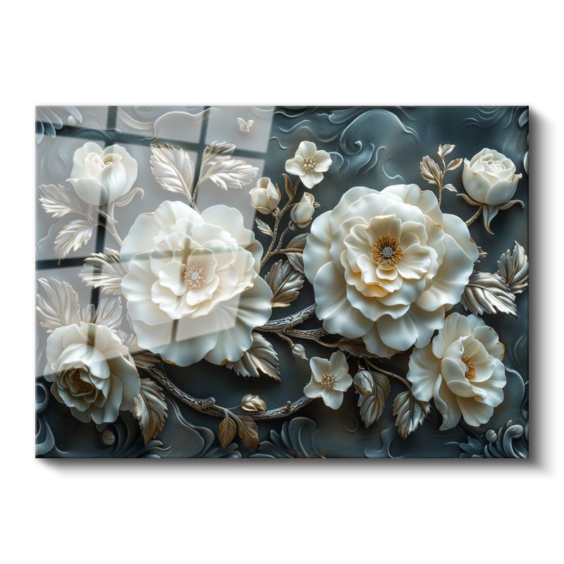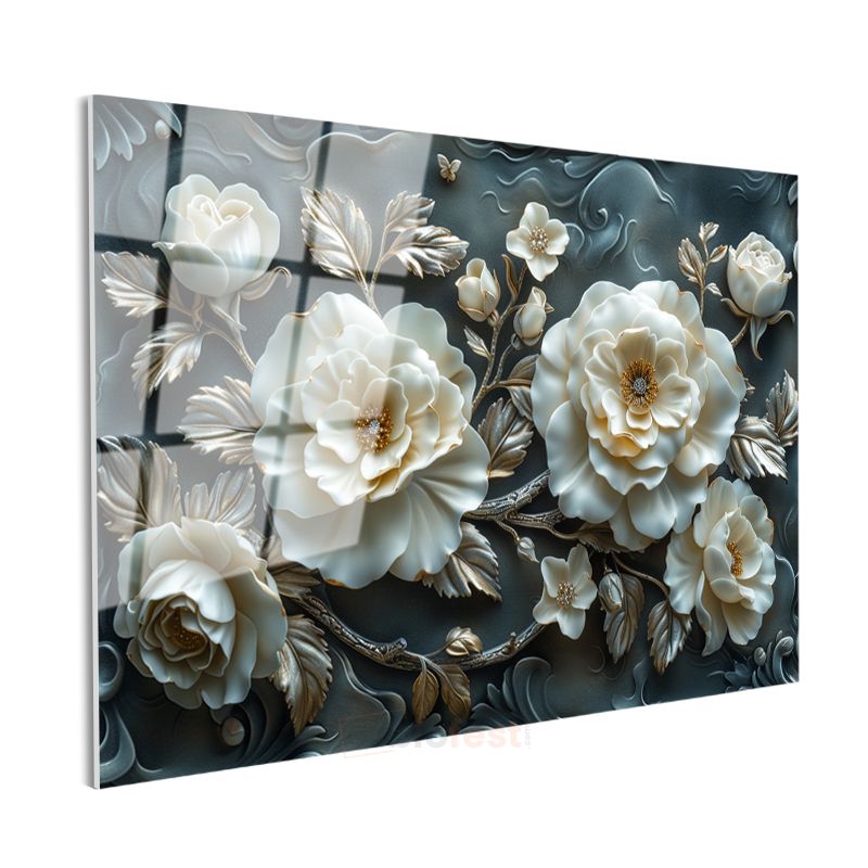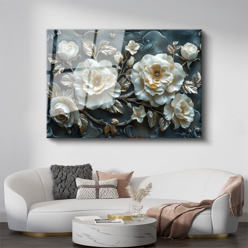 Krem Güller - Mavi Fonda Kabartma Görünümlü Dekoratif Sanat Cam Tablo