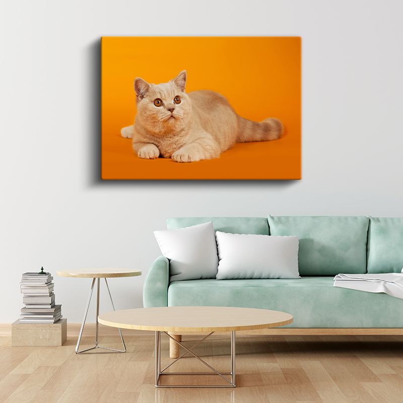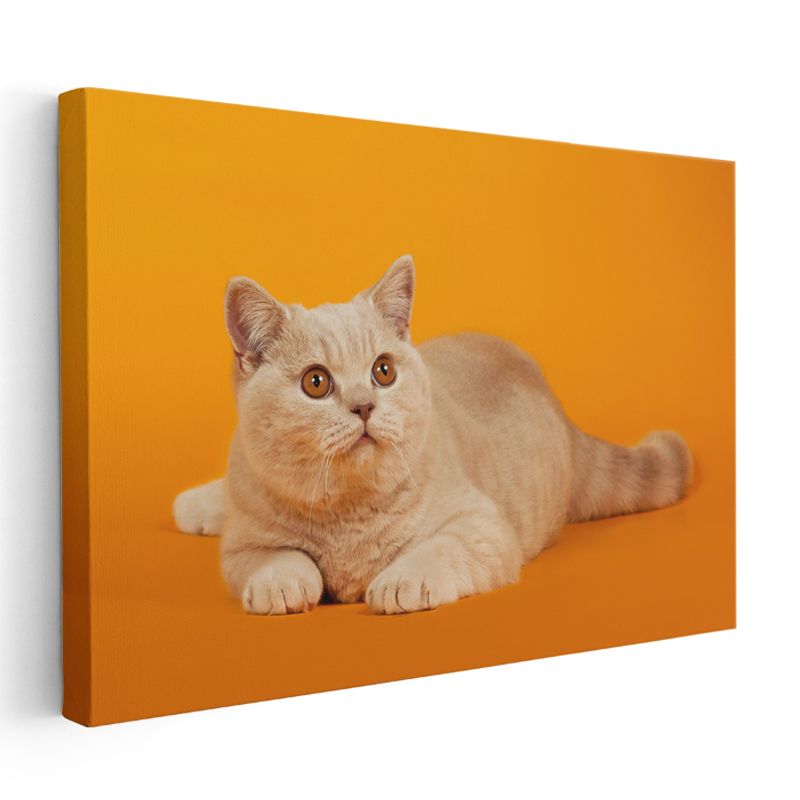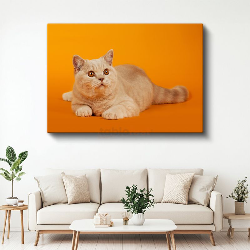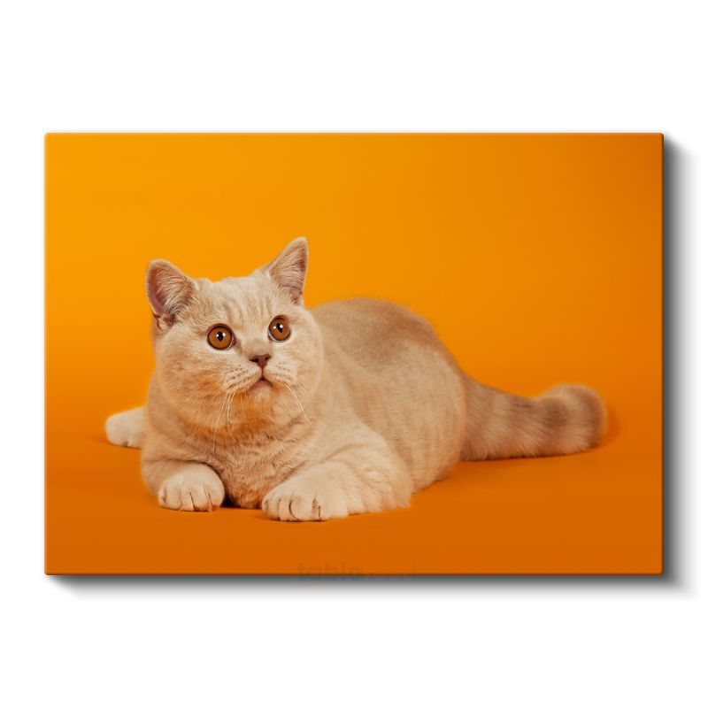 Krem Kedi - Turuncu Zeminde Zarif Duruş Kanvas Tablo