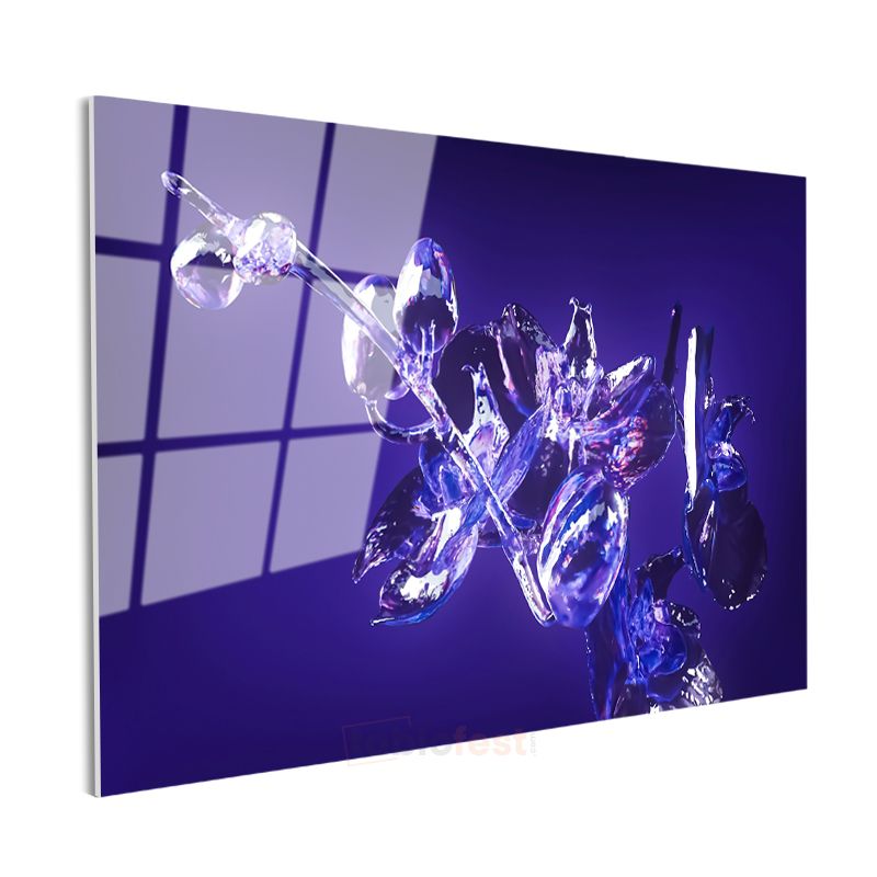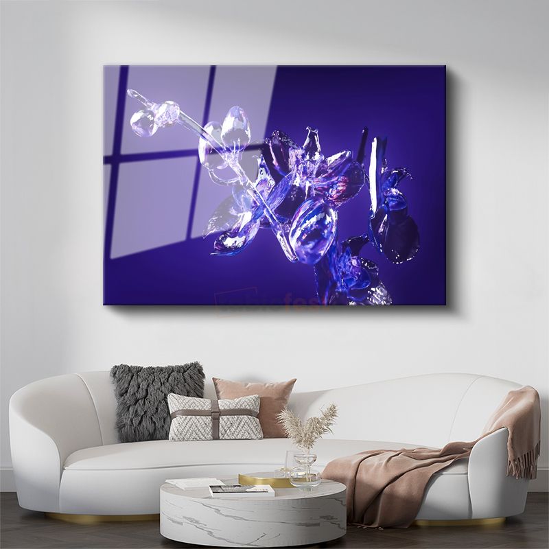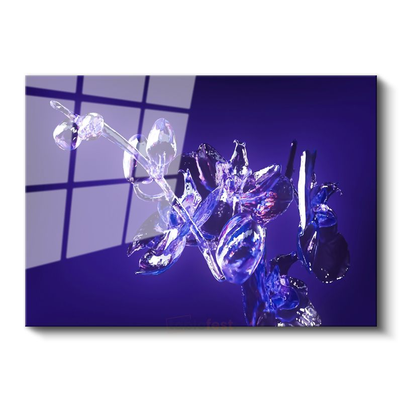 Kristal Çiçek - Mor Fonda Işıltılı Cam Sanatı Cam Tablo