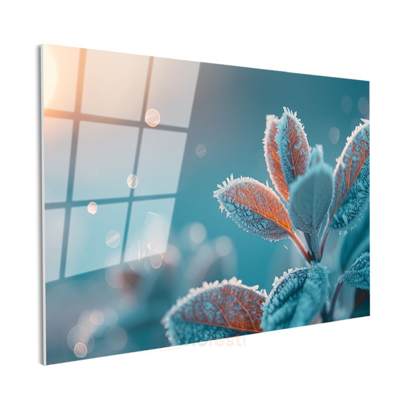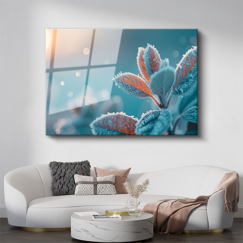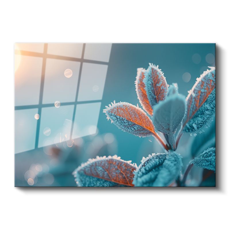 Kristal Yapraklar - Gün Doğumunda Buz Parıltılı Detaylar Cam Tablo