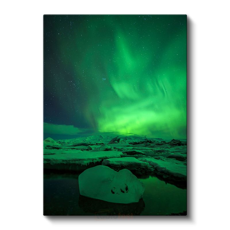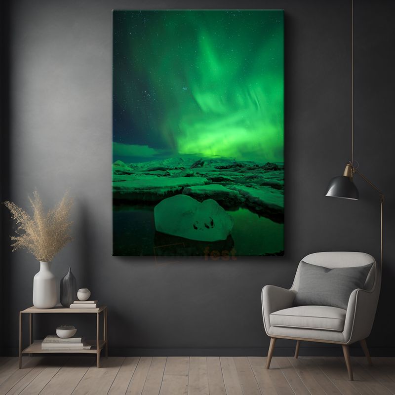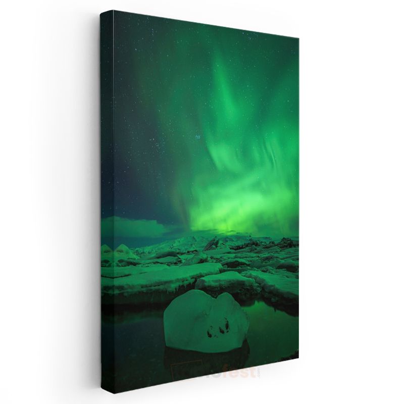 Kuzey Işıkları - Buzul Manzarada Yeşil Gökyüzü Dansı Kanvas Tablo