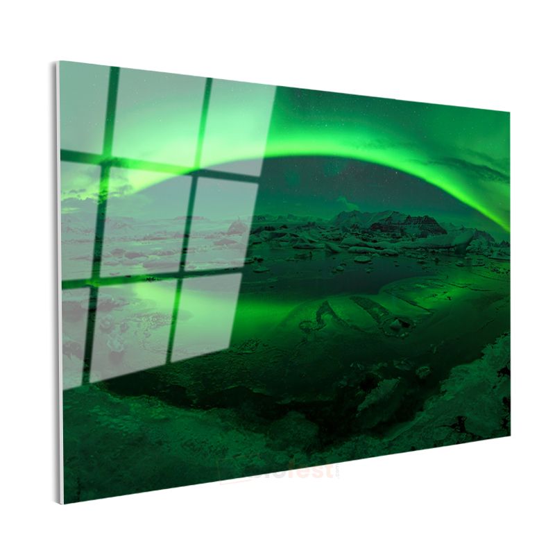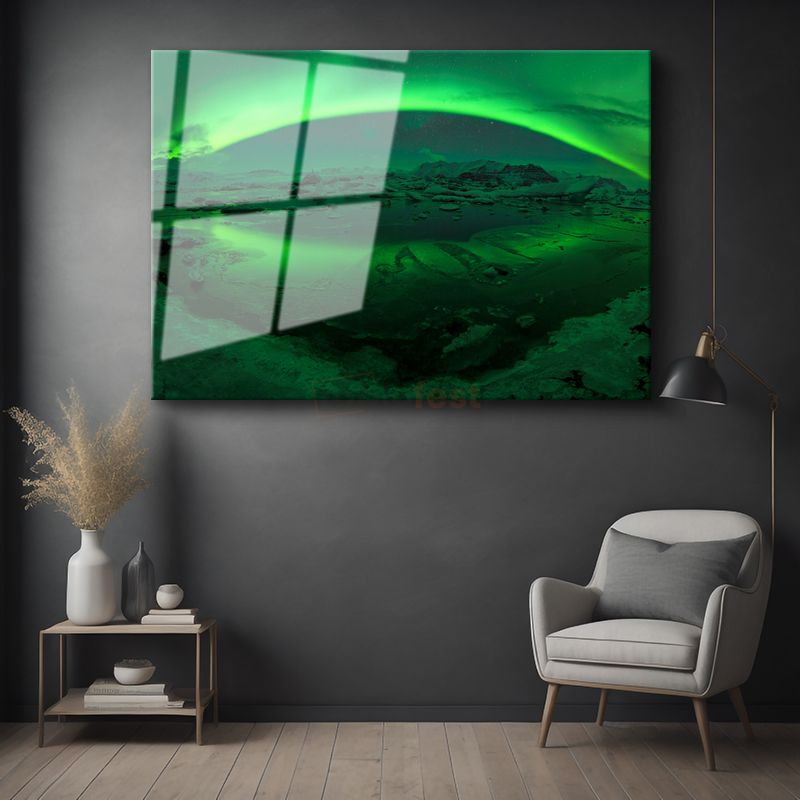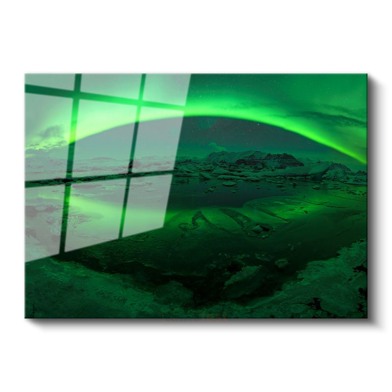 Kuzey Işıkları - Buzul Üzerinde Dans Eden Yeşil Işık Huzmesi Cam Tablo
