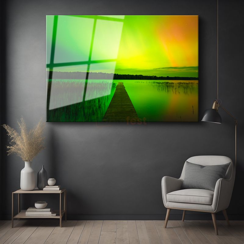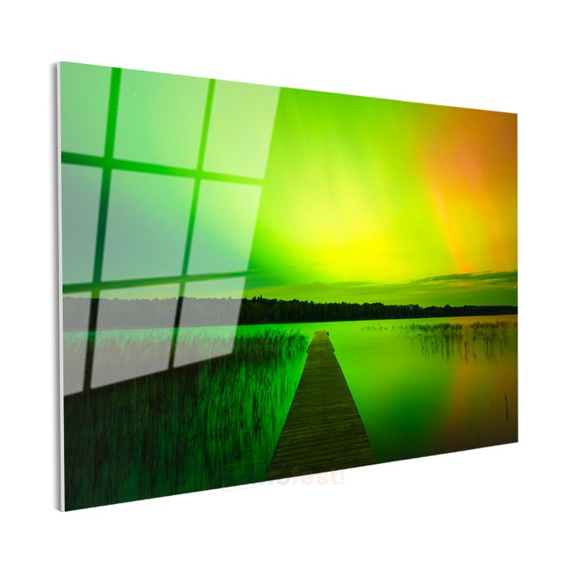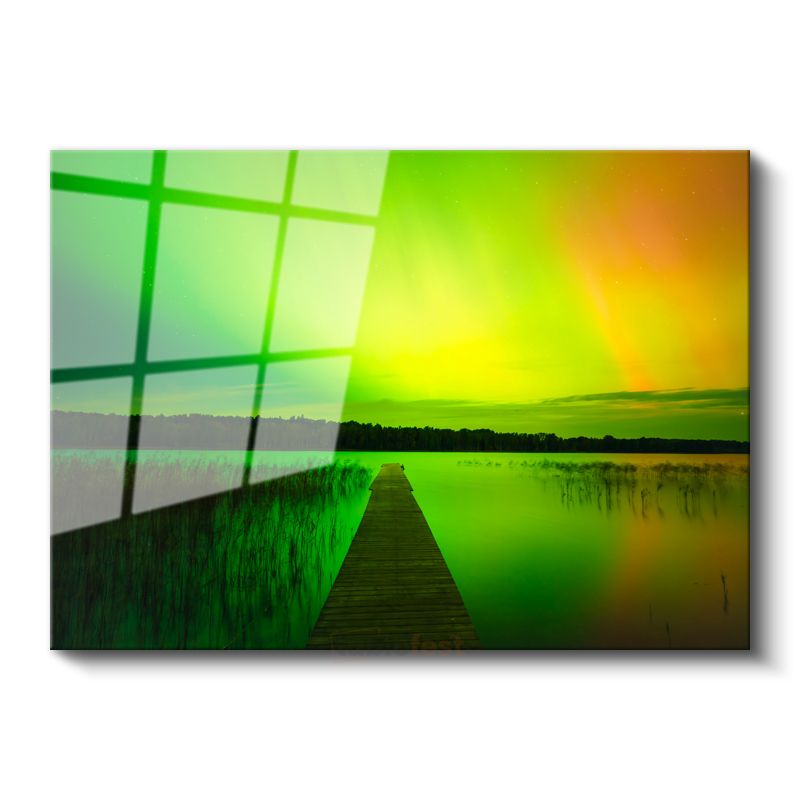 Kuzey Işıkları - Göl Üzerinde Yeşil Gökyüzü Dansı Cam Tablo