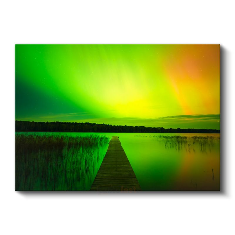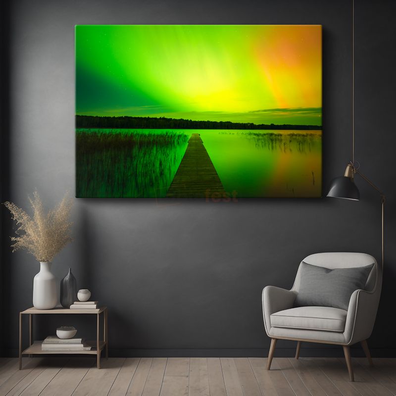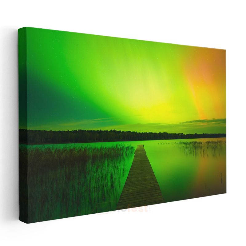 Kuzey Işıkları - Göl Üzerinde Yeşil Gökyüzü Dansı Kanvas Tablo