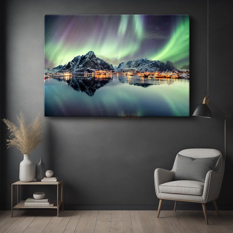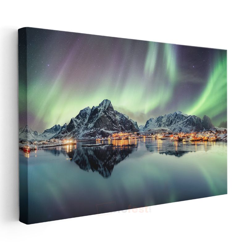 Kuzey Işıkları - Karlı Dağlar Üzerinde Büyülü Işık Dansı Kanvas Tablo