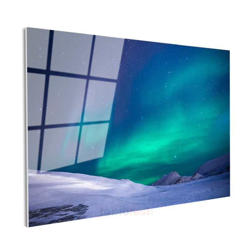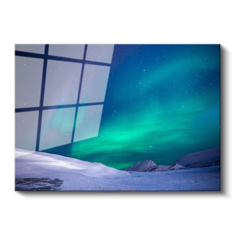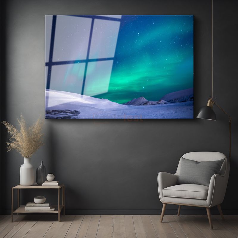 Kuzey Işıkları - Karlı Dağlar Üzerinde Dans Eden Gökyüzü Şöleni Cam Tablo