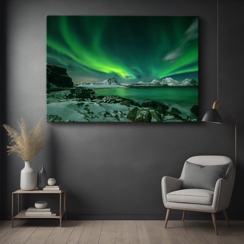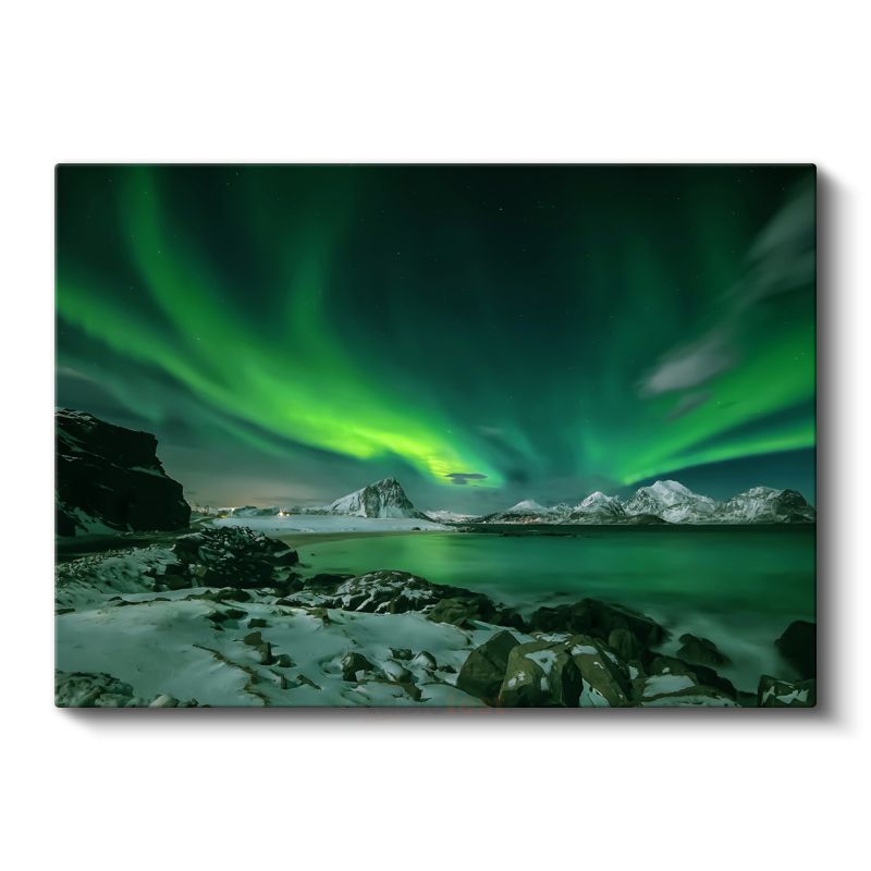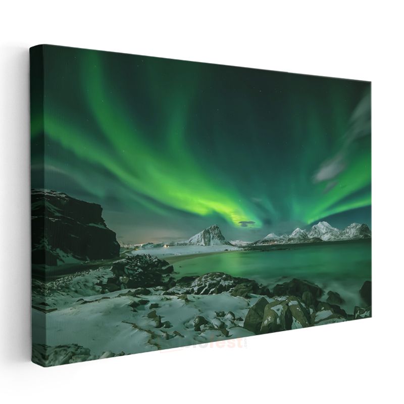 Kuzey Işıkları - Karlı Dağlar Üzerinde Yeşil Işıltılar Kanvas Tablo
