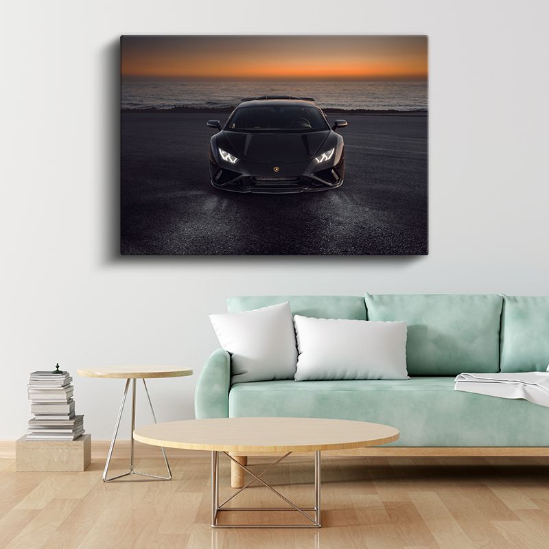 Lamborghini Huracan - Gün Batımında Siyah Süper Otomobil Kanvas Tablo