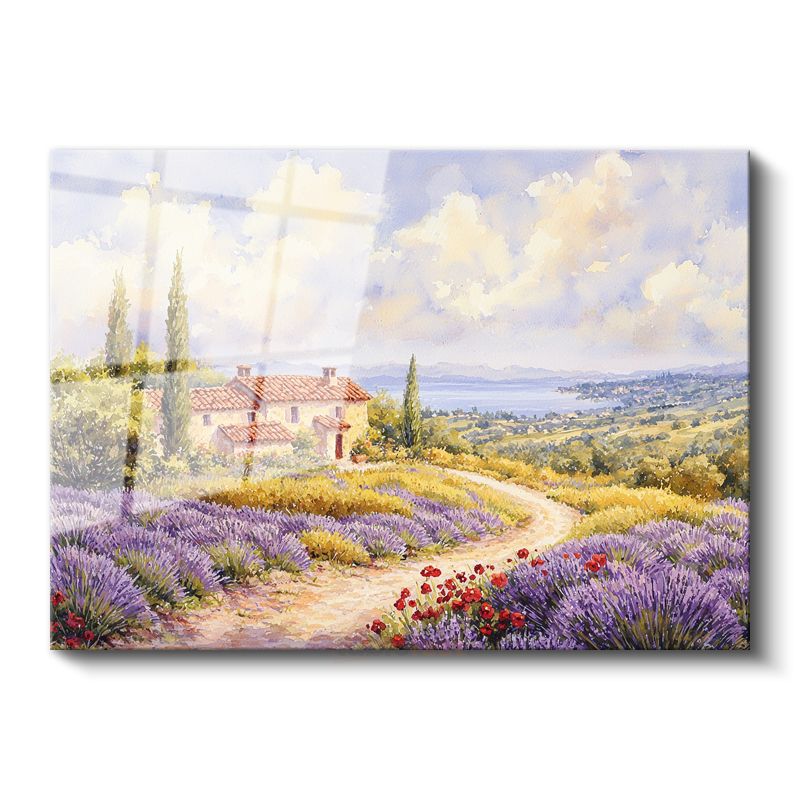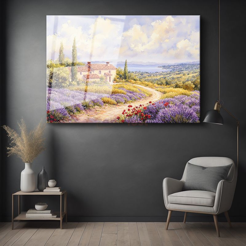 Lavanta Bahçesi - Kır Evi ve Çiçekli Patika Cam Tablo