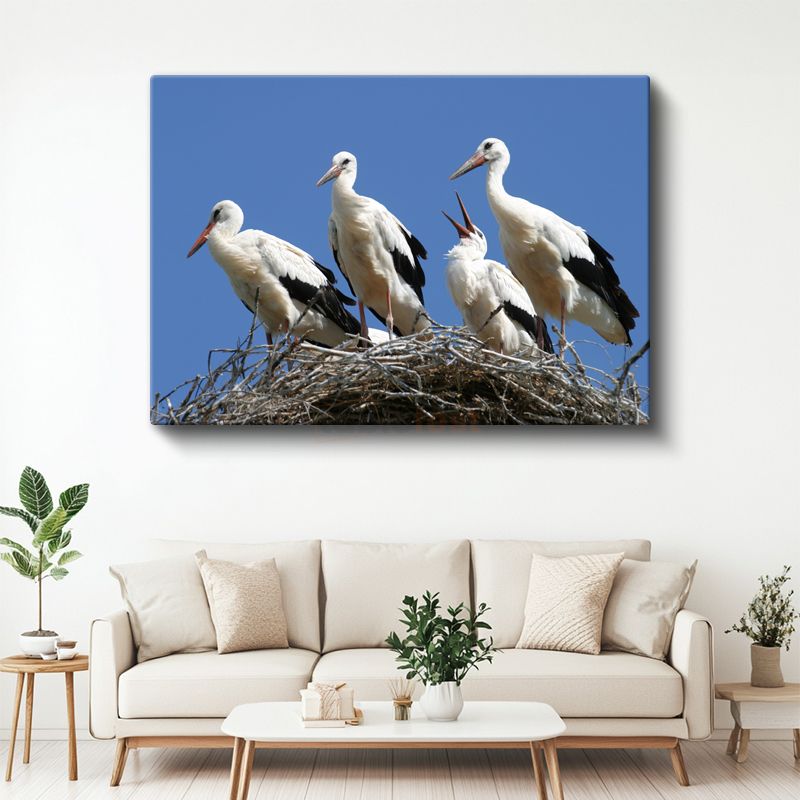 Leylek Ailesi - Yuvada Toplanan Kuşlar Kanvas Tablo