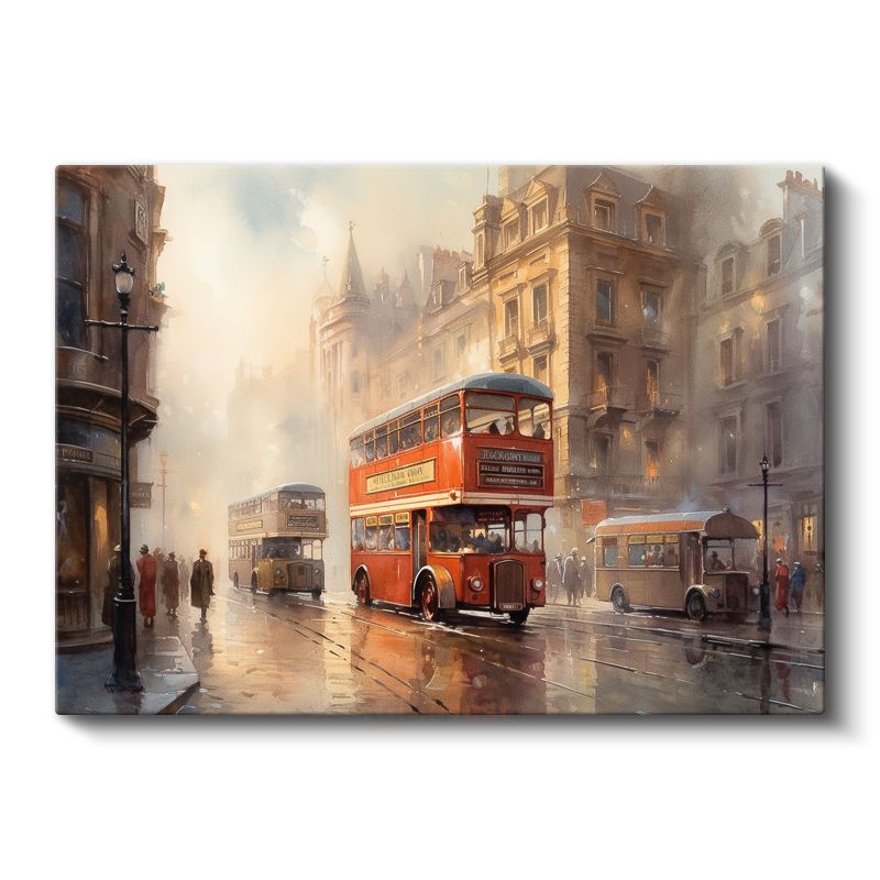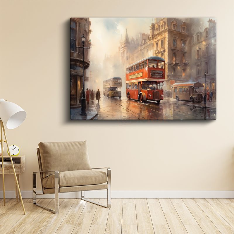 Londra Otobüsleri - Sisli Şehir Sokağında Klasik Ulaşım Kanvas Tablo
