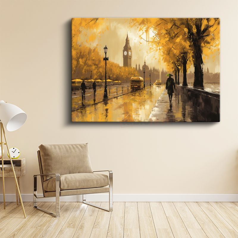 Londra Sonbaharı - Big Ben ve Yağmurlu Sokaklar Kanvas Tablo