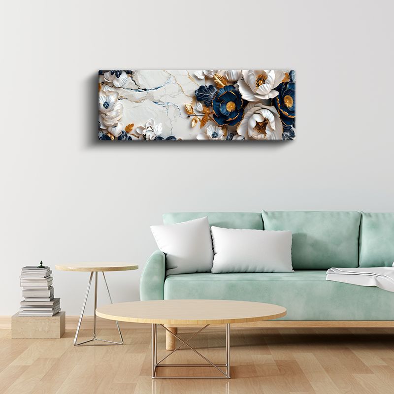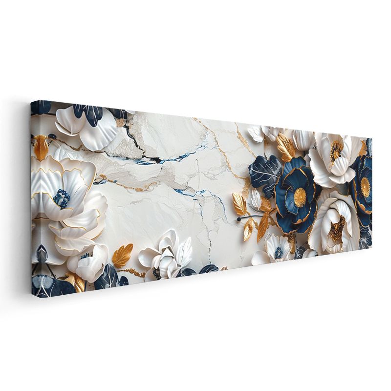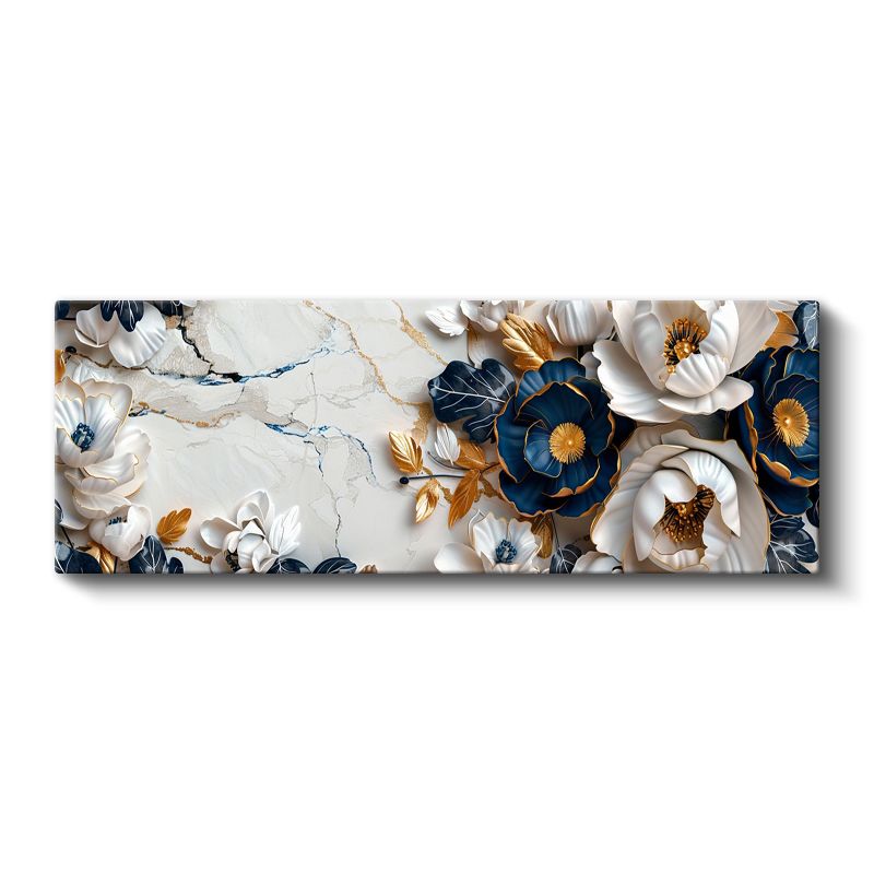 Lüks Çiçek Kompozisyonu - 3D Kabartma Görünümlü Mavi ve Beyaz Çiçekler Altın Detaylı Kanvas Tablo