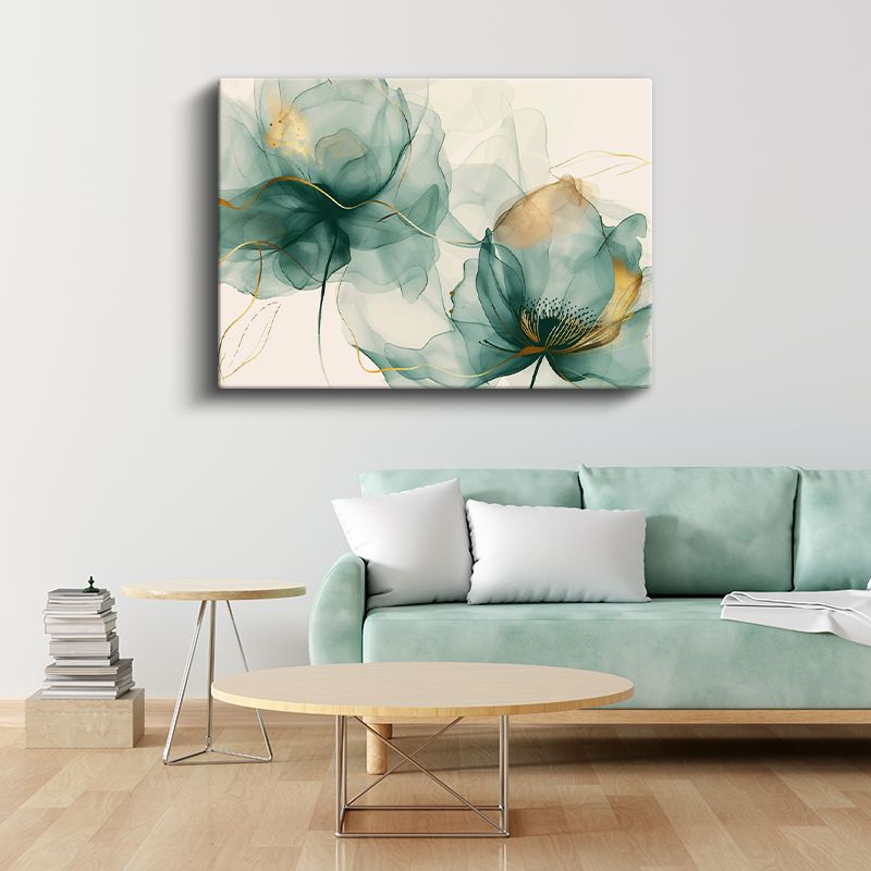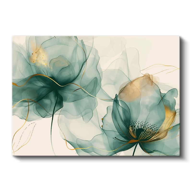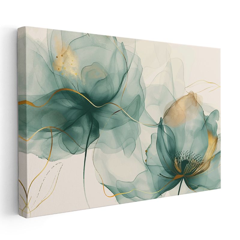Lüks Çiçek Sanatı - Altın Turkuaz 3D Kabartma Görünümlü Dekoratif Tasarım Kanvas Tablo
