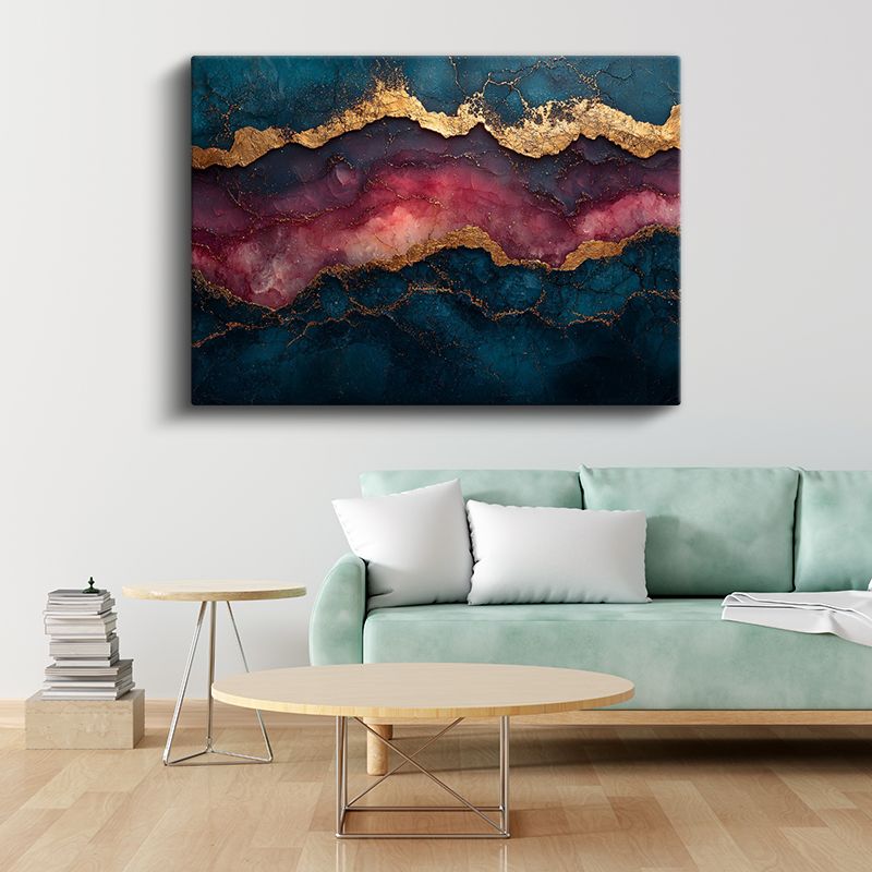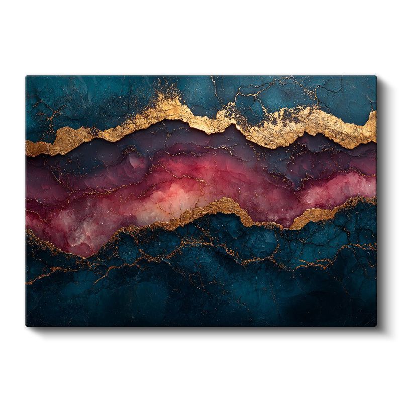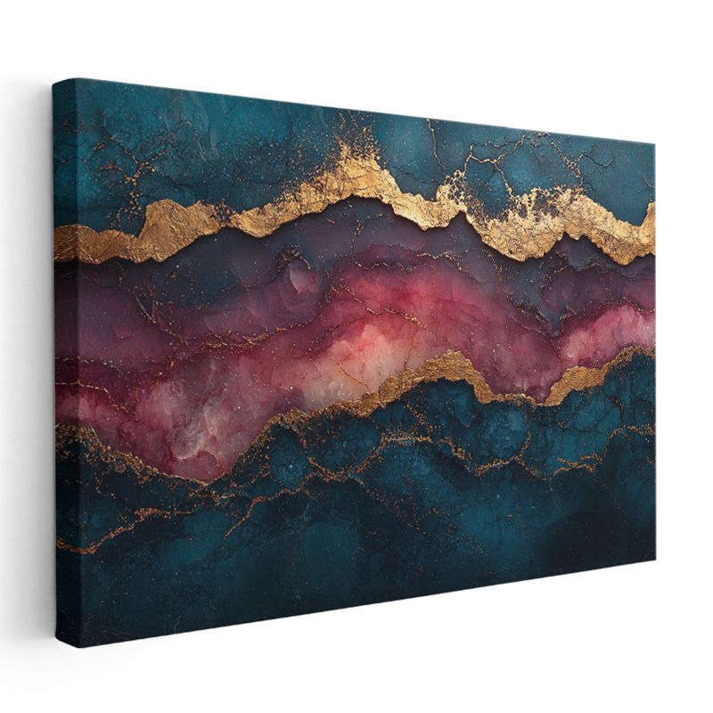 Lüks Mermer Efekti - Lacivert ve Bordo Altın Damarlar Kanvas Tablo