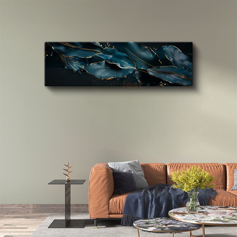 Lüks Yapraklar - Lacivert ve Altın Detaylı Zarif Kanvas Tablo
