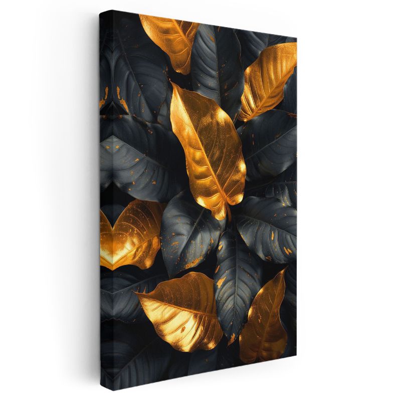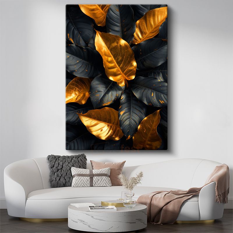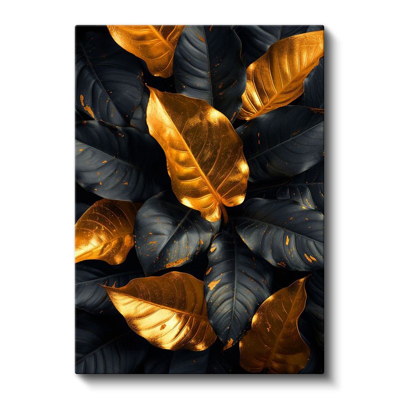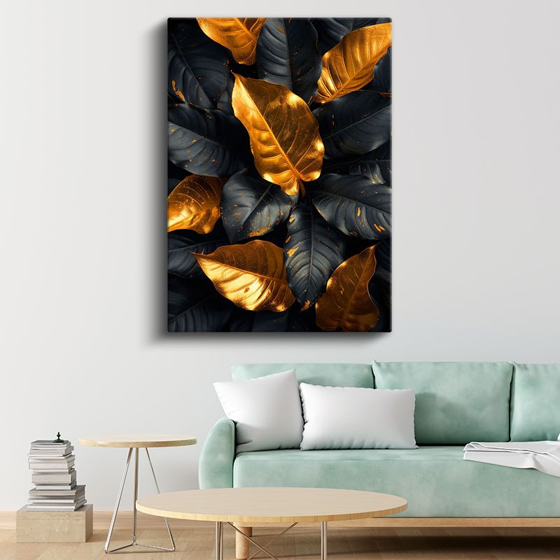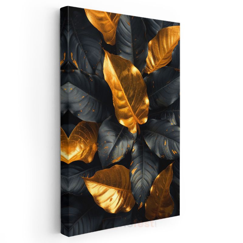Lüks Yapraklar - Siyah Zeminde Altın Detaylı Botanik Kanvas Tablo