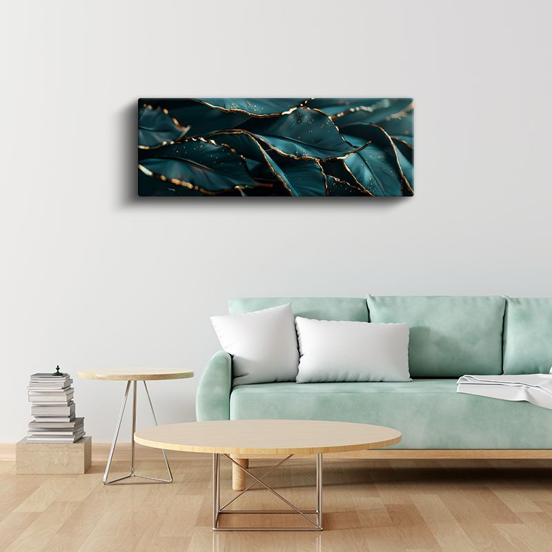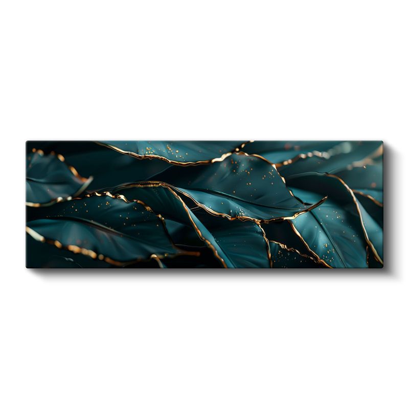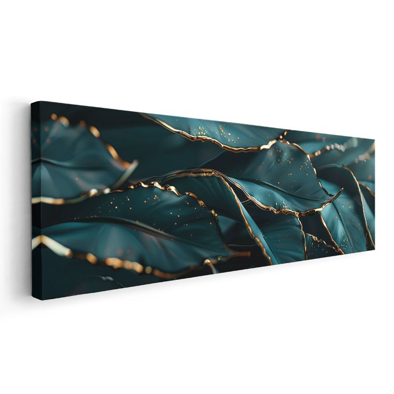 Lüks Yapraklar - Turkuaz Zeminde Altın Kenarlı Botanik Tasarım Kanvas Tablo
