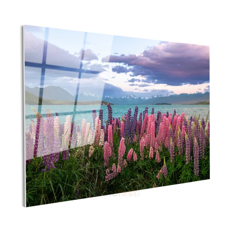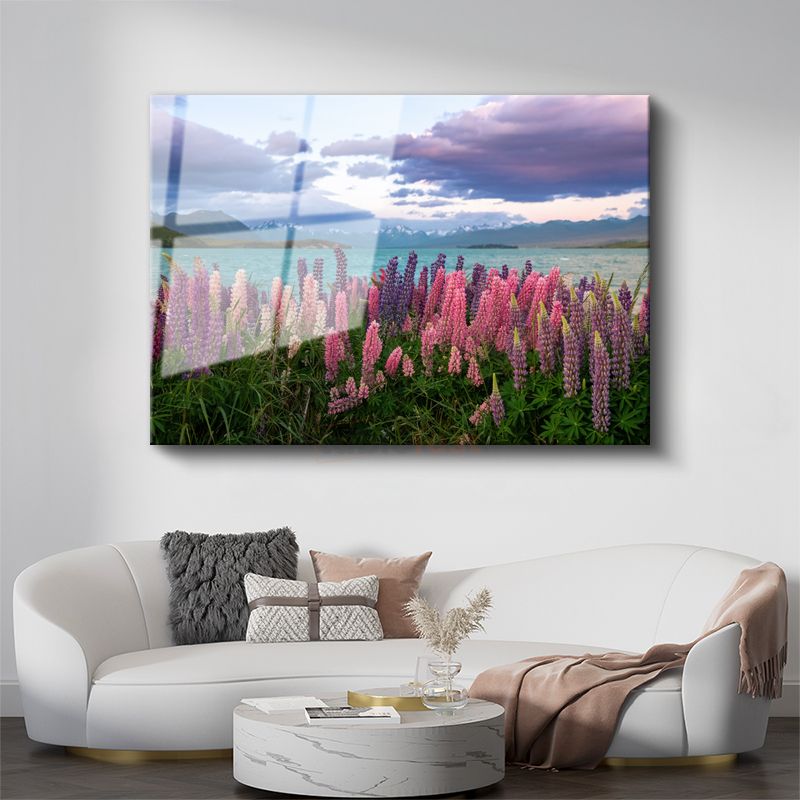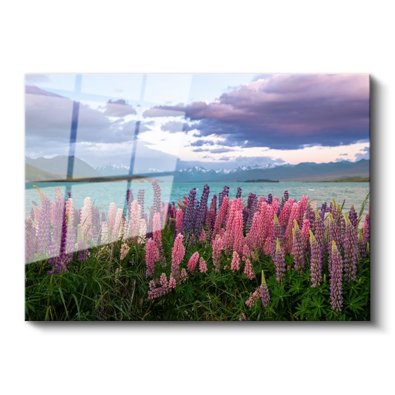 Lüpin Çiçekleri - Göl Manzaralı Doğa Fotoğrafı Cam Tablo