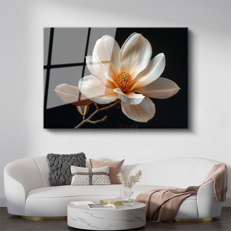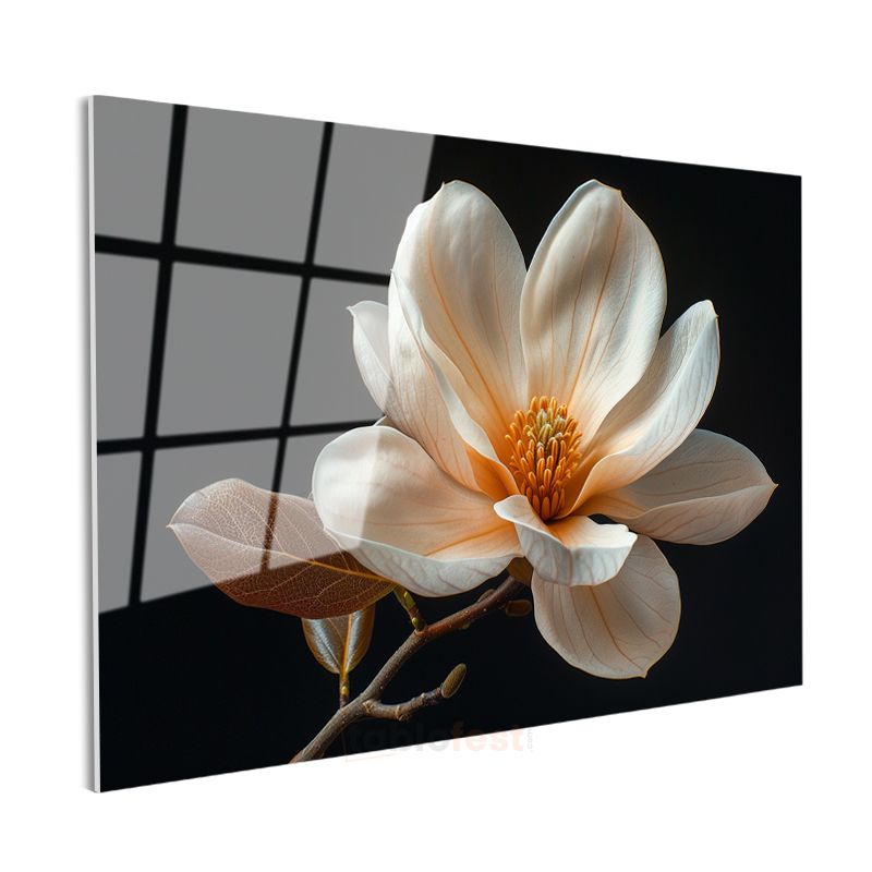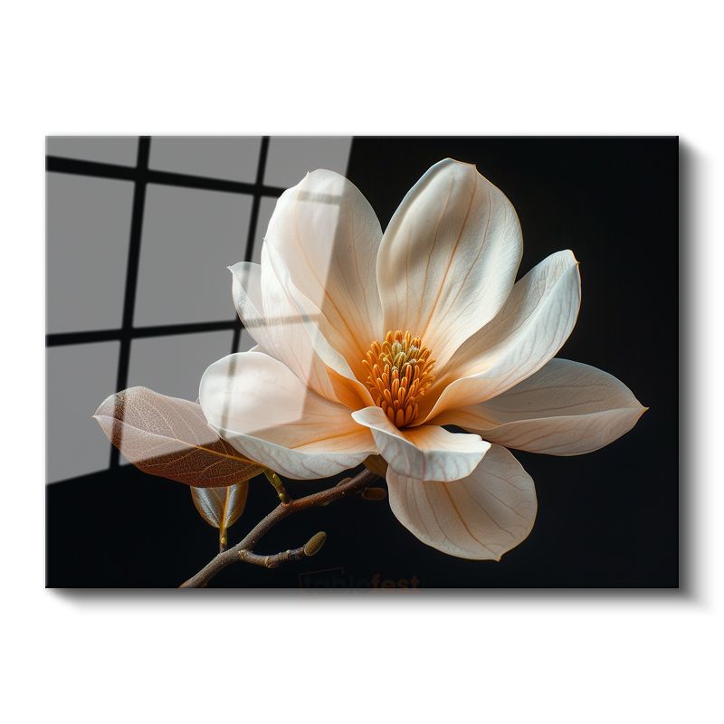 Magnolya Çiçeği - Siyah Zeminde Detaylı Botanik İllüstrasyon Cam Tablo