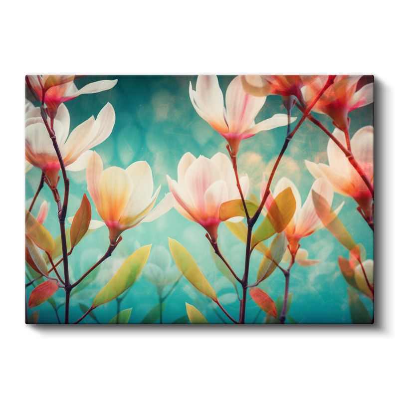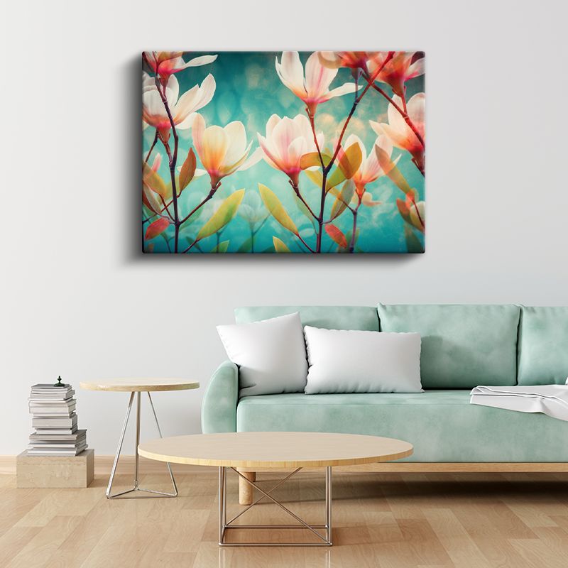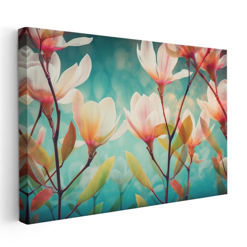 Magnolya Çiçekleri - Turkuaz Fonda Zarif Dal Kompozisyonu Kanvas Tablo