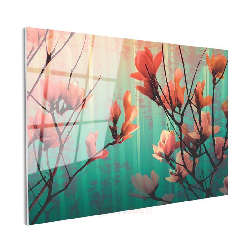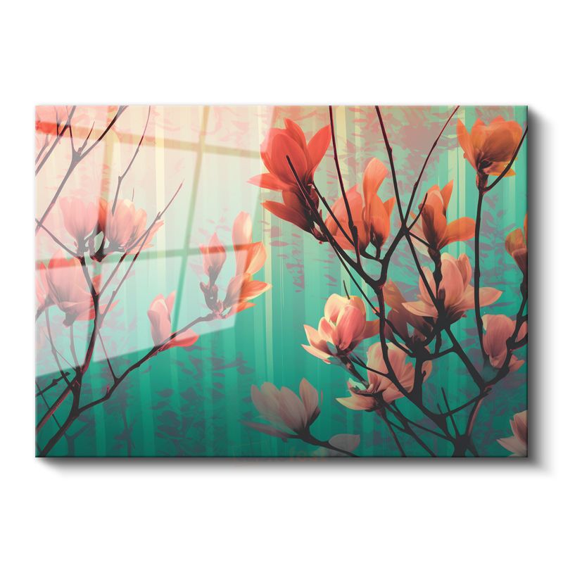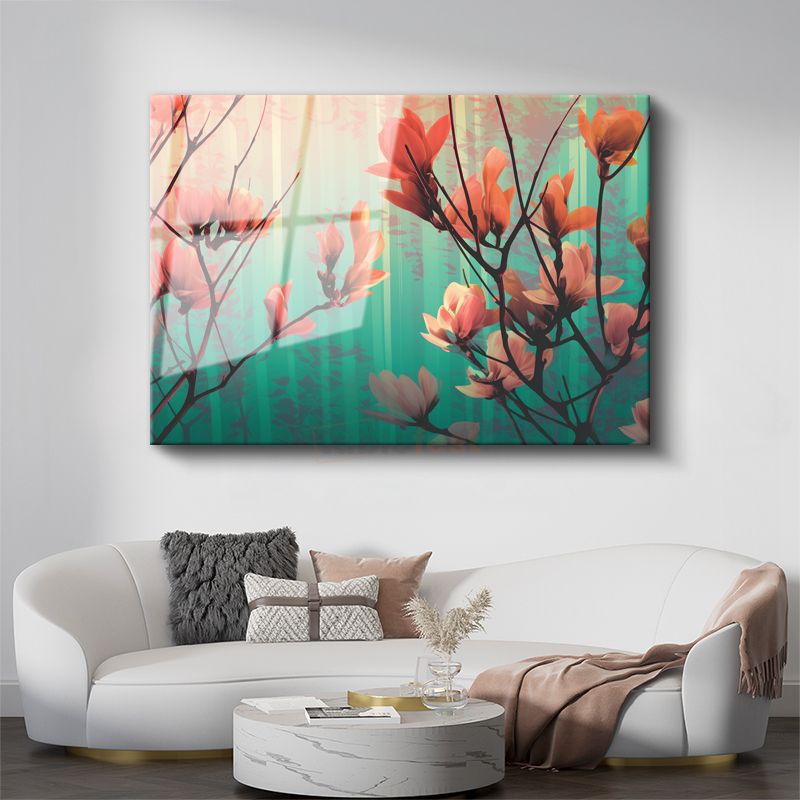 Manolya Dalları - Turkuaz Fonlu Sanatsal Cam Tablo