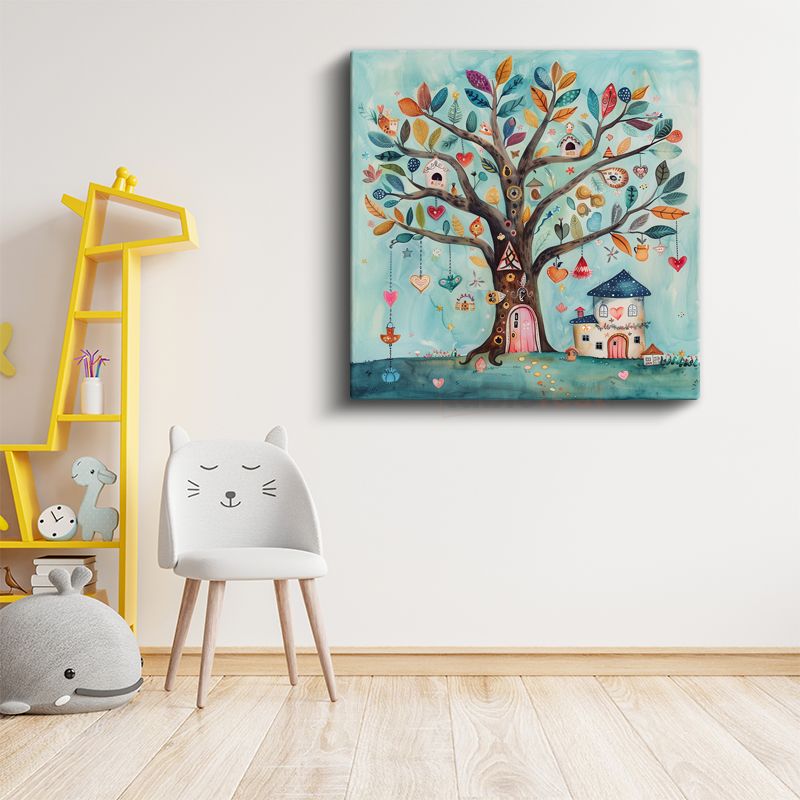 Masal Ağacı - Renkli Yapraklar ve Küçük Ev Kanvas Tablo