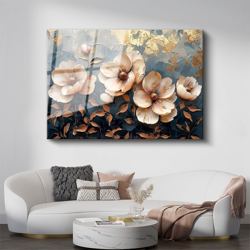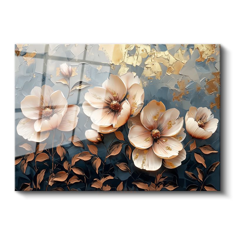 Mavi Altın Yapraklar - Sulu Boya Efektli Zarif Tasarım Cam Tablo