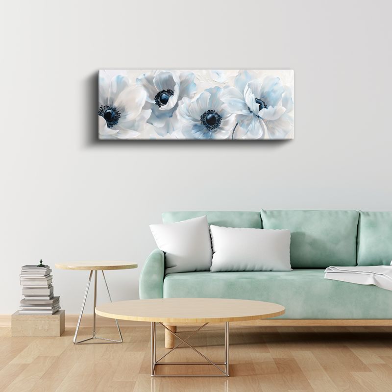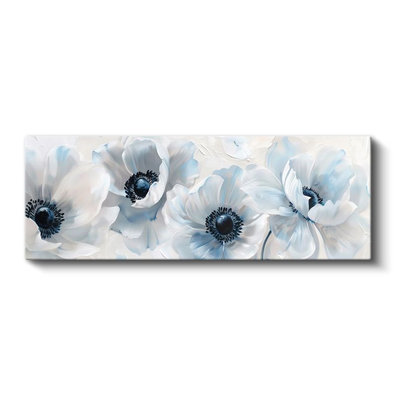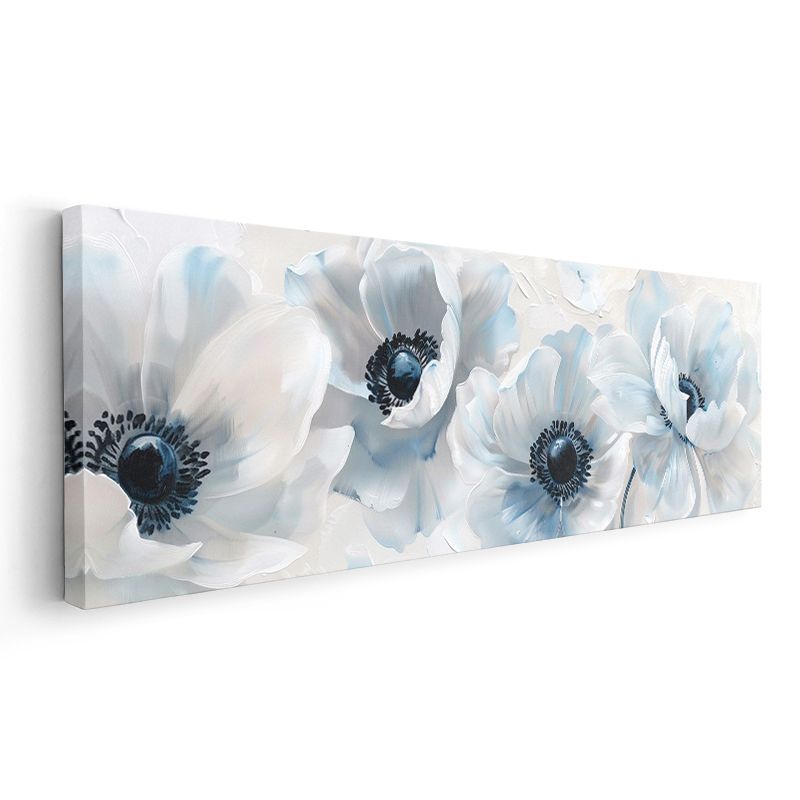 Mavi Anemonlar - Siyah Merkezli Beyaz Zeminde Yağlı Boya Tarzı Kanvas Tablo