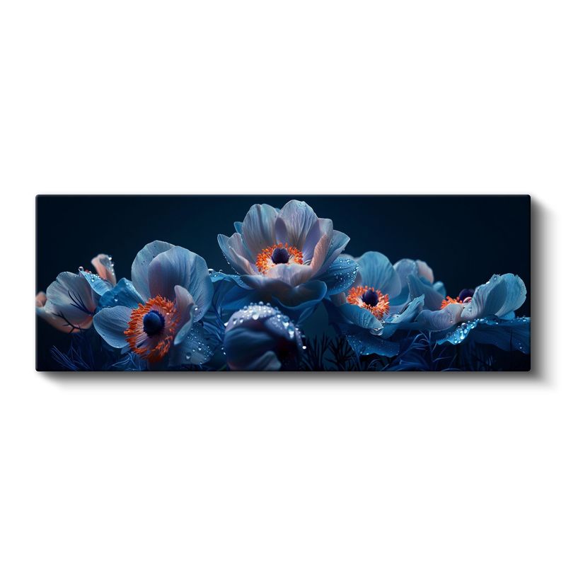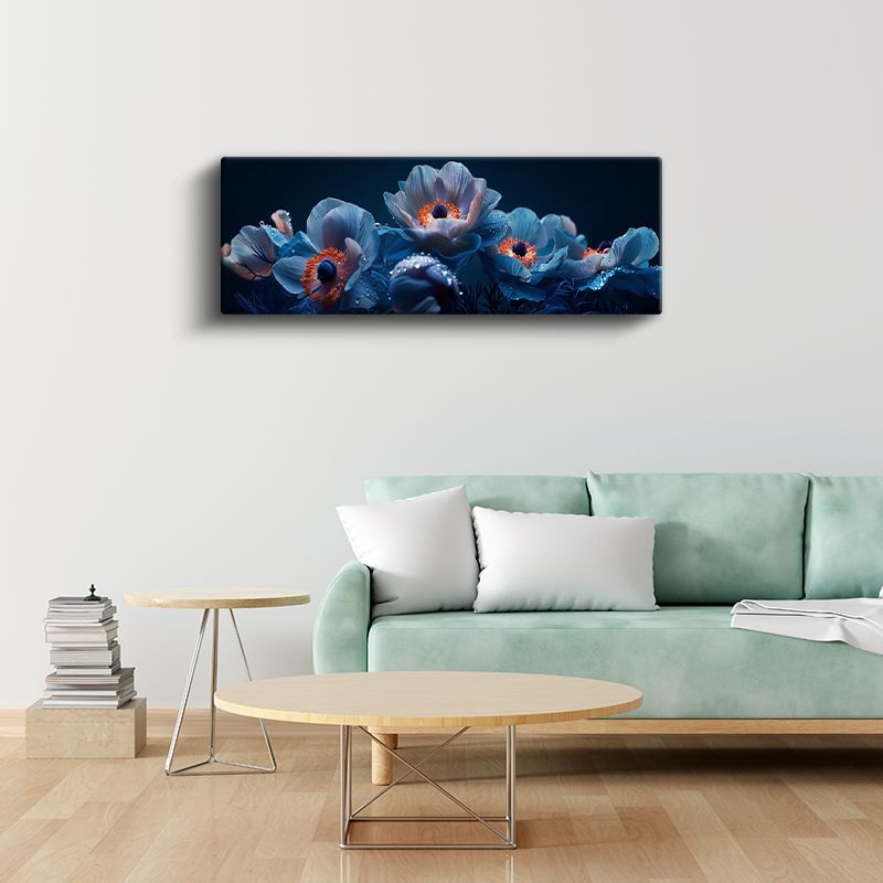 Mavi Anemonlar - Turuncu Merkezli Siyah Zeminde Çiçek Fotoğrafı Kanvas Tablo