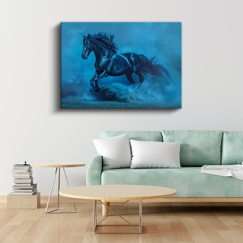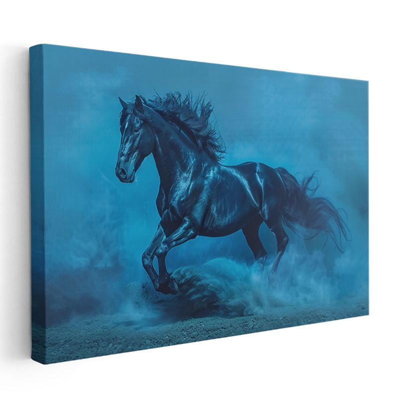 Mavi Atmosfer - Toz Bulutu İçinde Koşan Siyah At Kanvas Tablo
