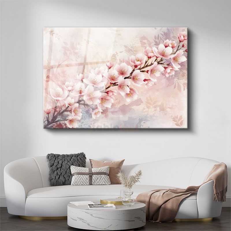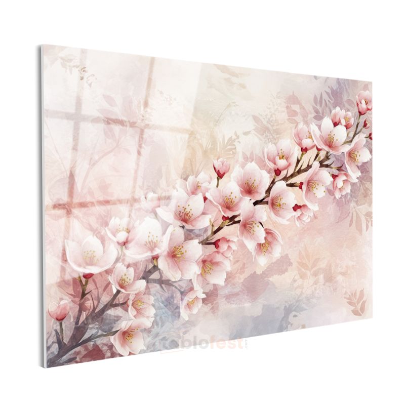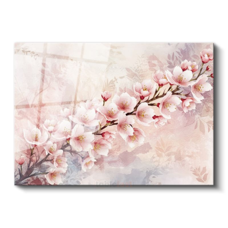 Mavi Beyaz Çiçekler - Altın Yapraklı D Çiçek Kompozisyonu Cam Tablo