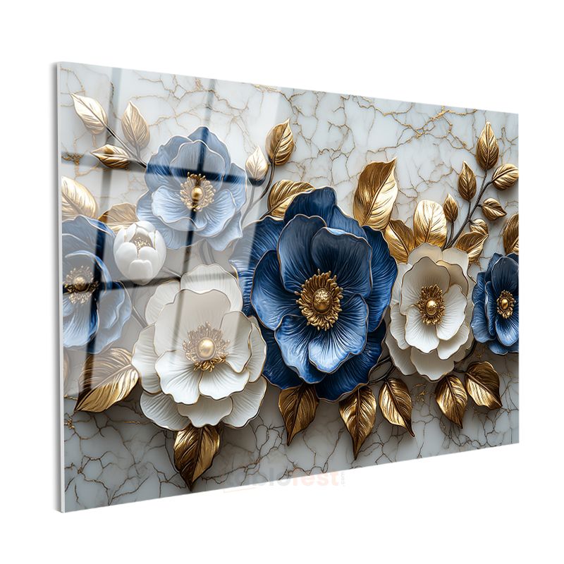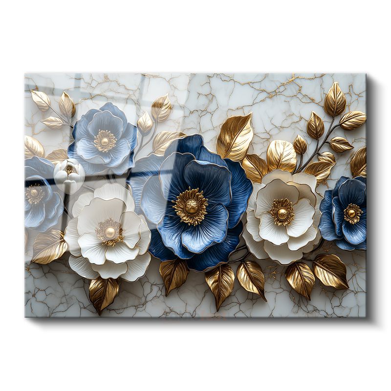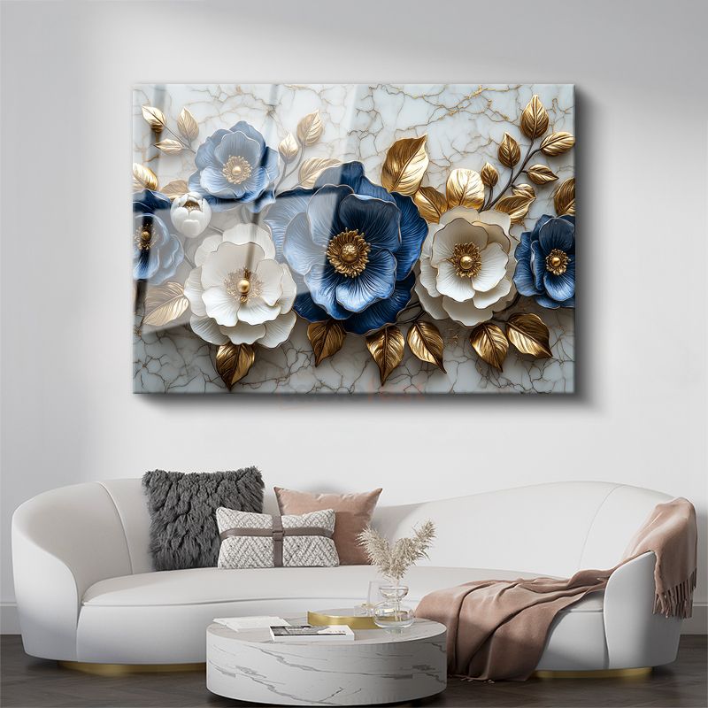 Mavi Beyaz Çiçekler - Altın Yapraklı Mermer Dokulu Dekoratif Cam Tablo