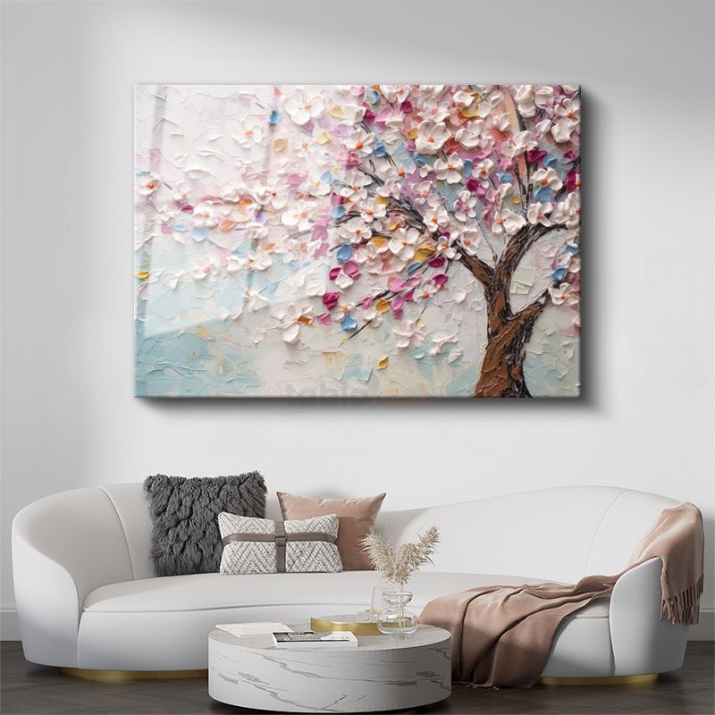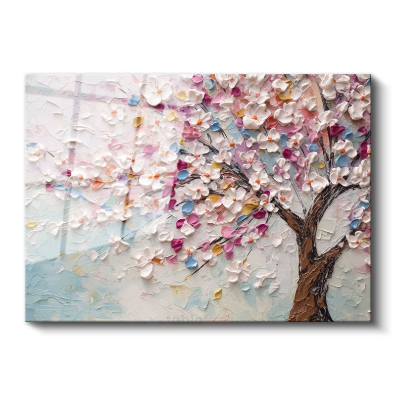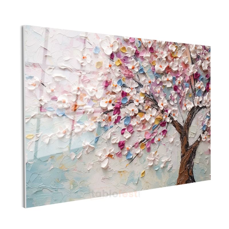 Mavi Beyaz Çiçekler - Mermer Zeminde D Çiçek Kompozisyonu Cam Tablo