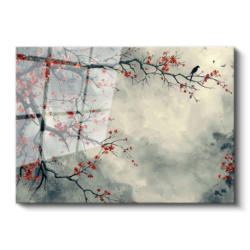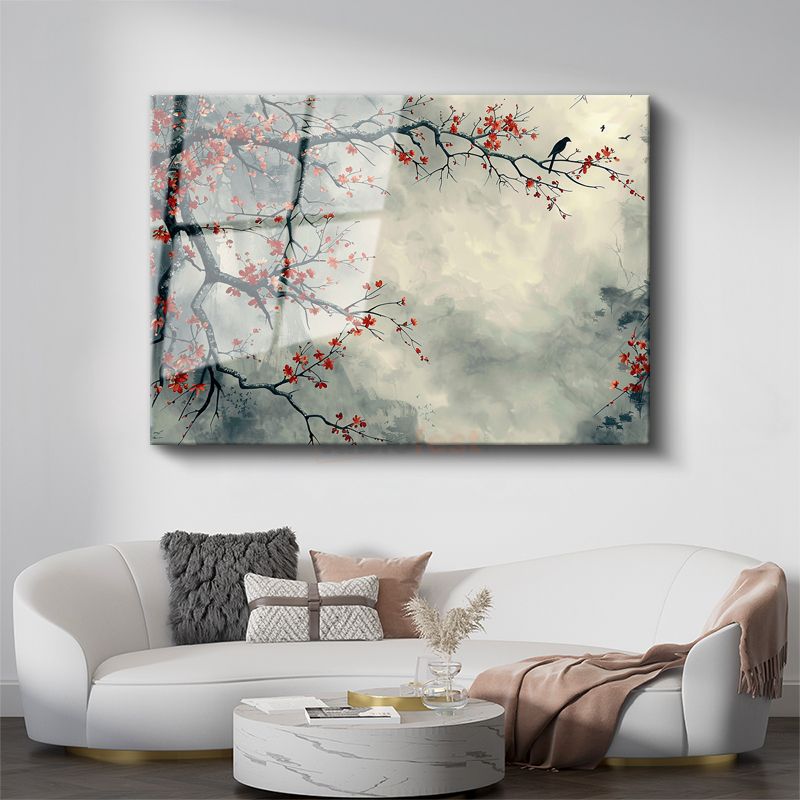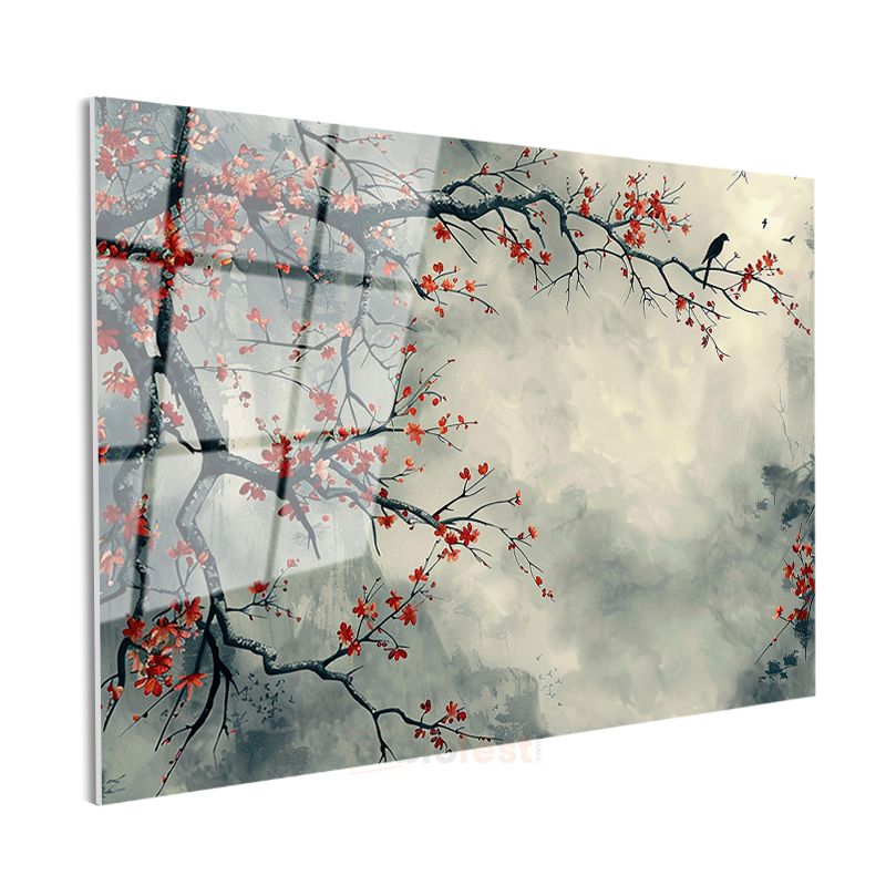 Mavi Çiçek İkilisi - Altın Detaylı Minimalist Tasarım Cam Tablo