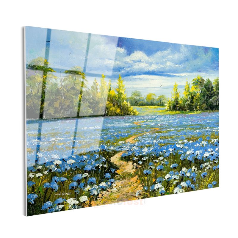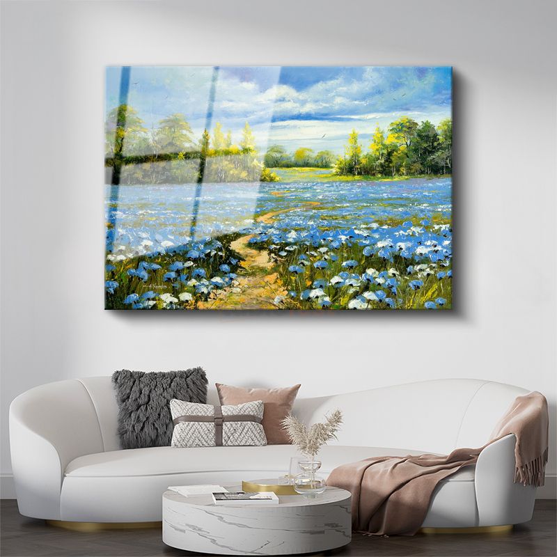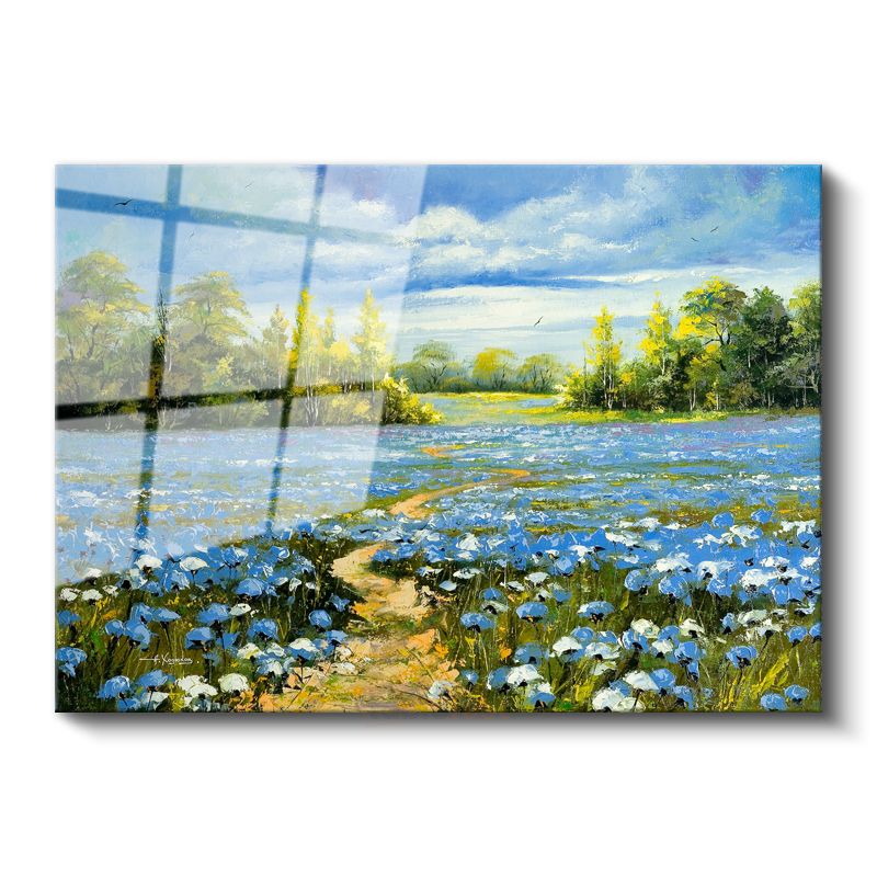 Mavi Çiçek Tarlası - Yağlı Boya Teknikli Manzara Cam Tablo