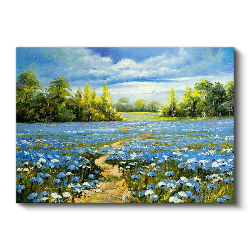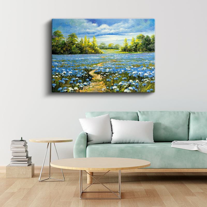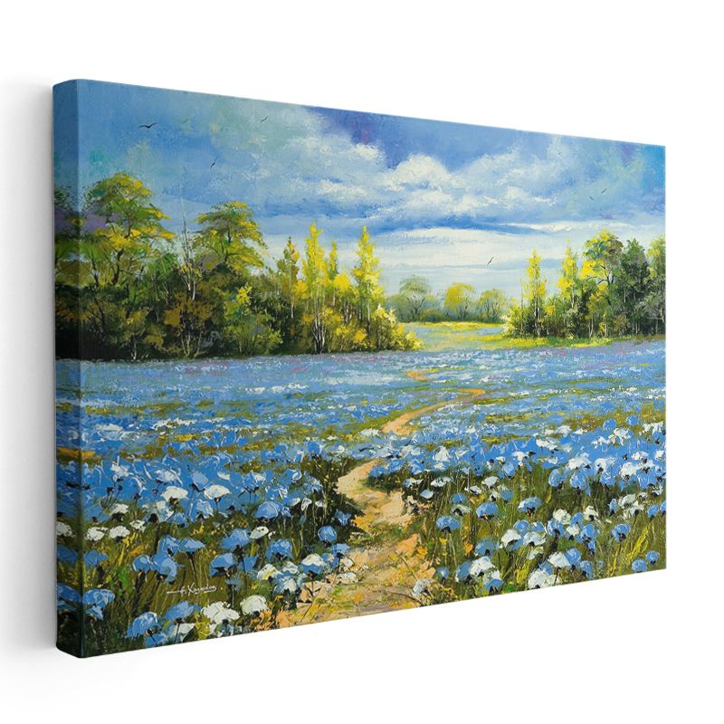 Mavi Çiçek Tarlası - Yağlı Boya Teknikli Manzara Kanvas Tablo