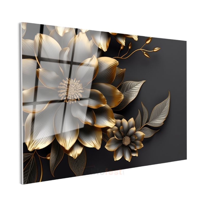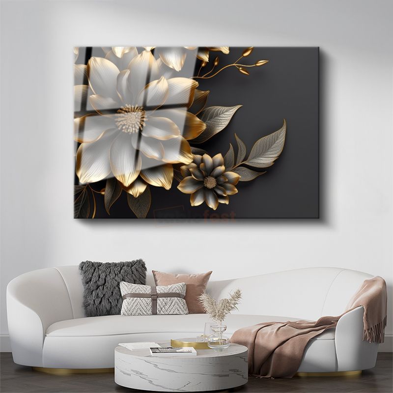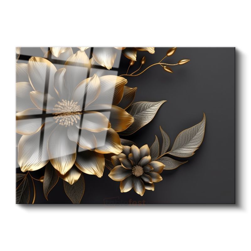 Mavi Çiçekler - Altın Detaylı Zarif Kompozisyon Cam Tablo