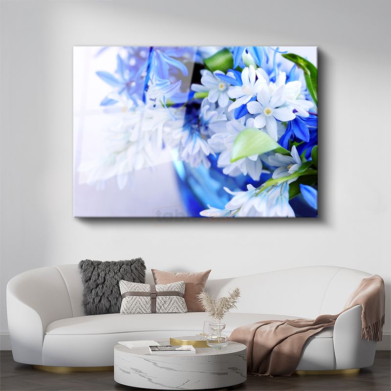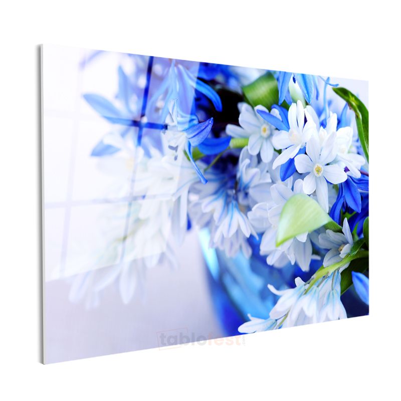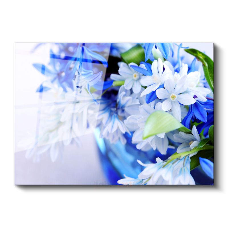 Mavi Çiçekler - Beyaz Detaylı Zarif Buket Cam Tablo