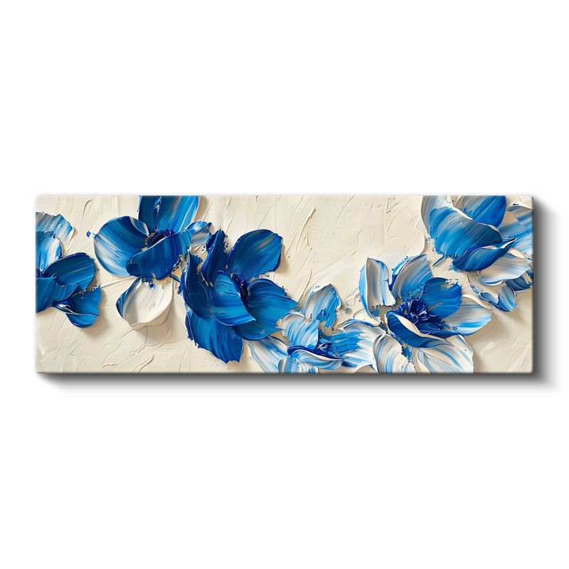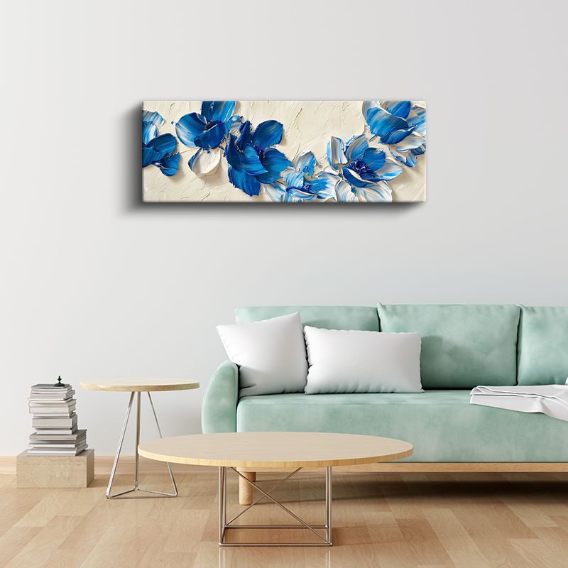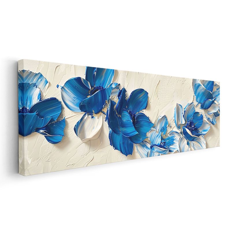 Mavi Çiçekler - Krem Fonda Yağlı Boya Efektli Kanvas Tablo