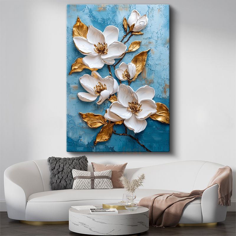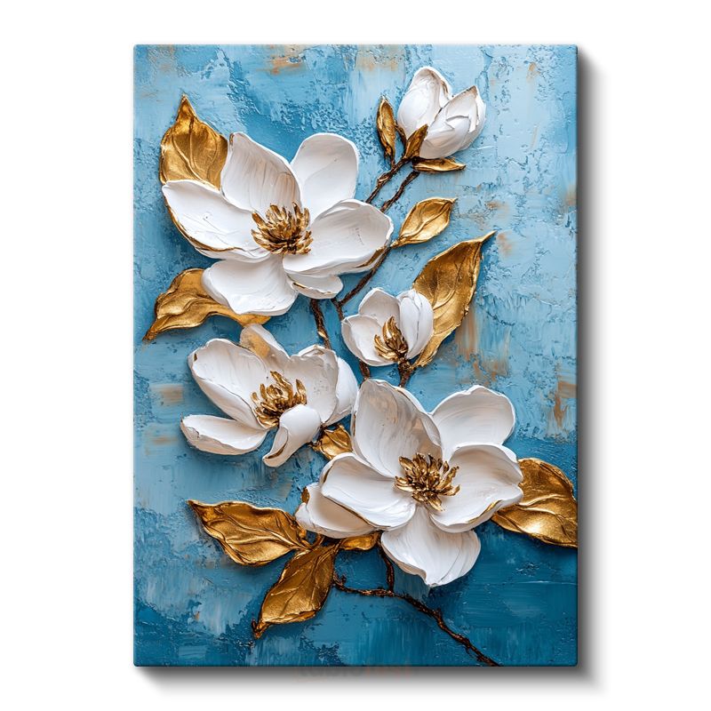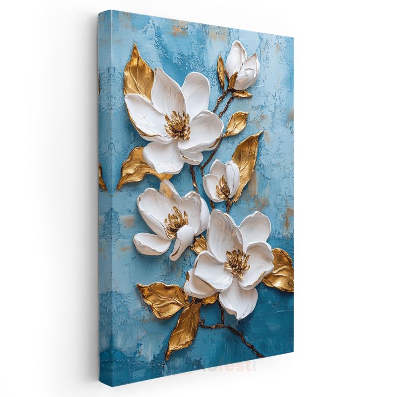 Mavi Fonda Beyaz Manolyalar - Altın Yapraklı 3D Çiçek Kanvas Tablo
