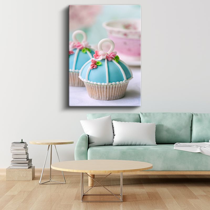 Mavi Fondanlı Cupcake - Çiçek Detaylı Zarif Pasta Kanvas Tablo