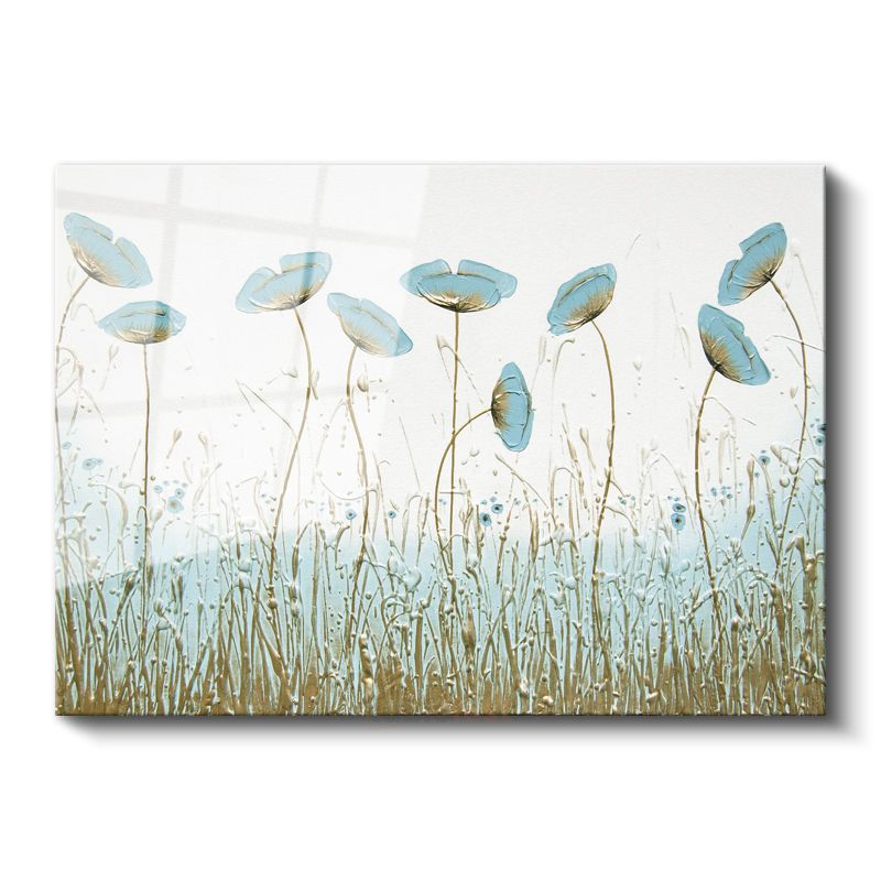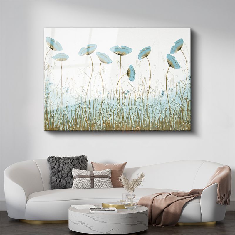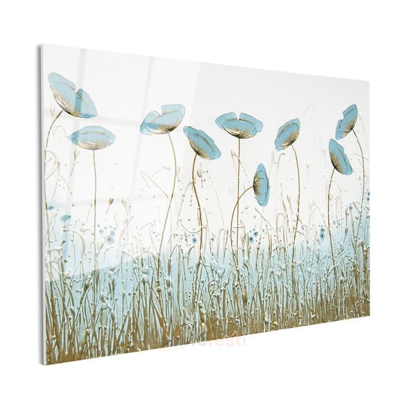 Mavi Gelincikler - Altın Detaylı Çayır Manzarası Cam Tablo