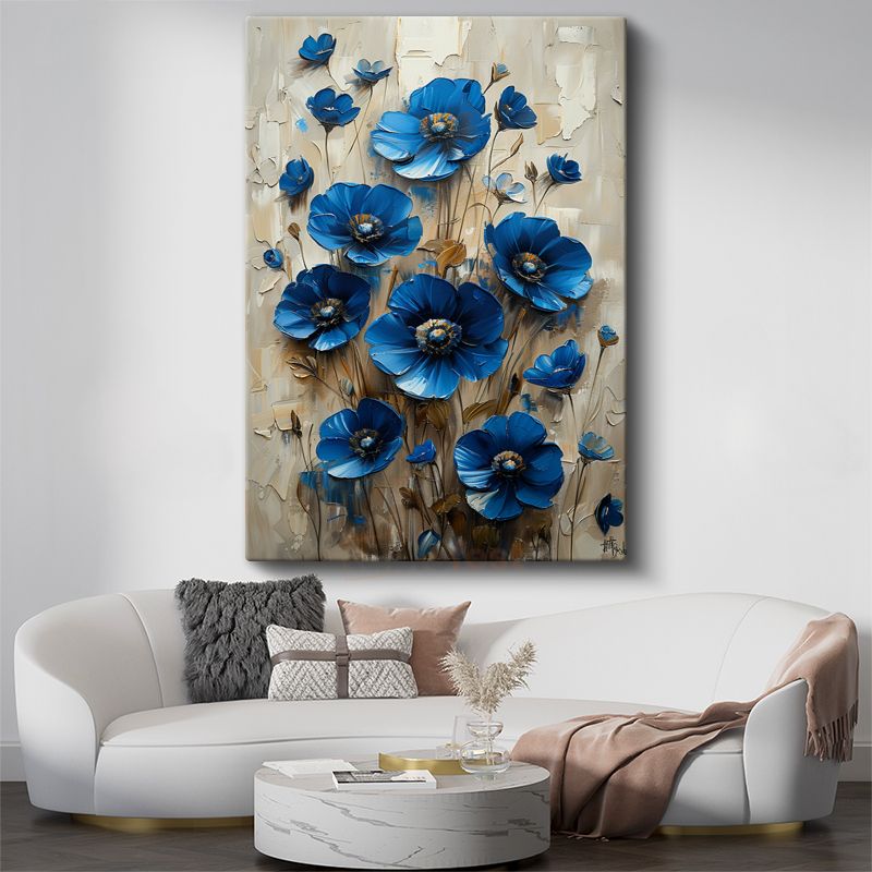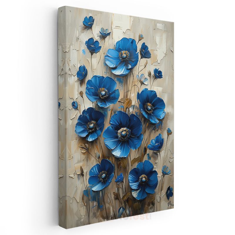 Mavi Gelincikler - Dokulu Boya Tekniğiyle Çiçek Buketi Kanvas Tablo