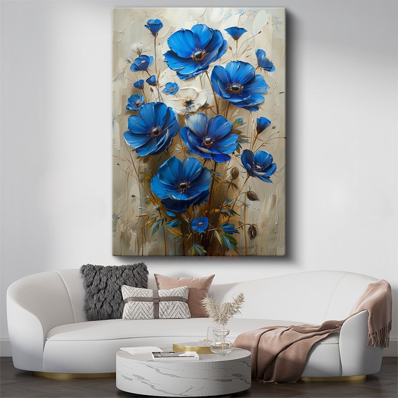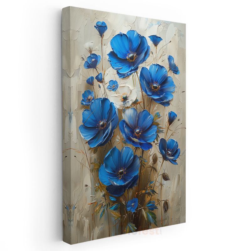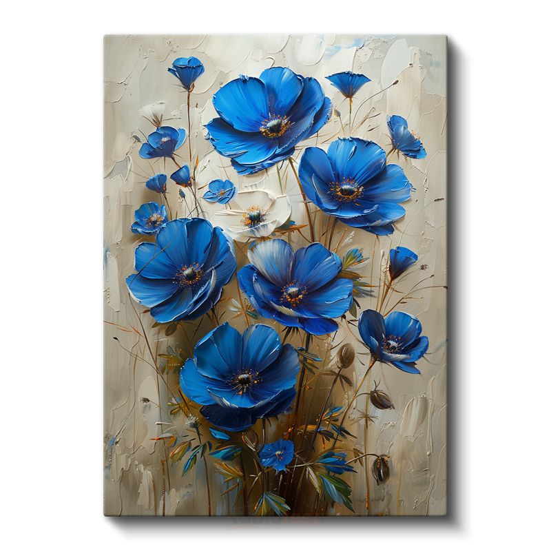 Mavi Gelincikler - Dokulu Zemin Üzerinde Çiçek Buketi Kanvas Tablo