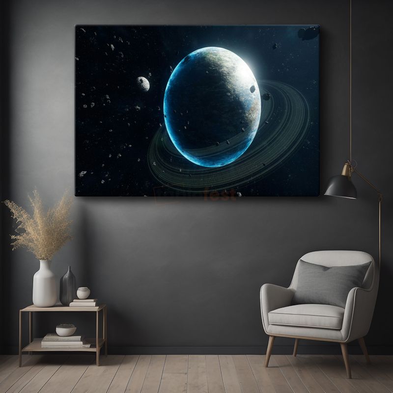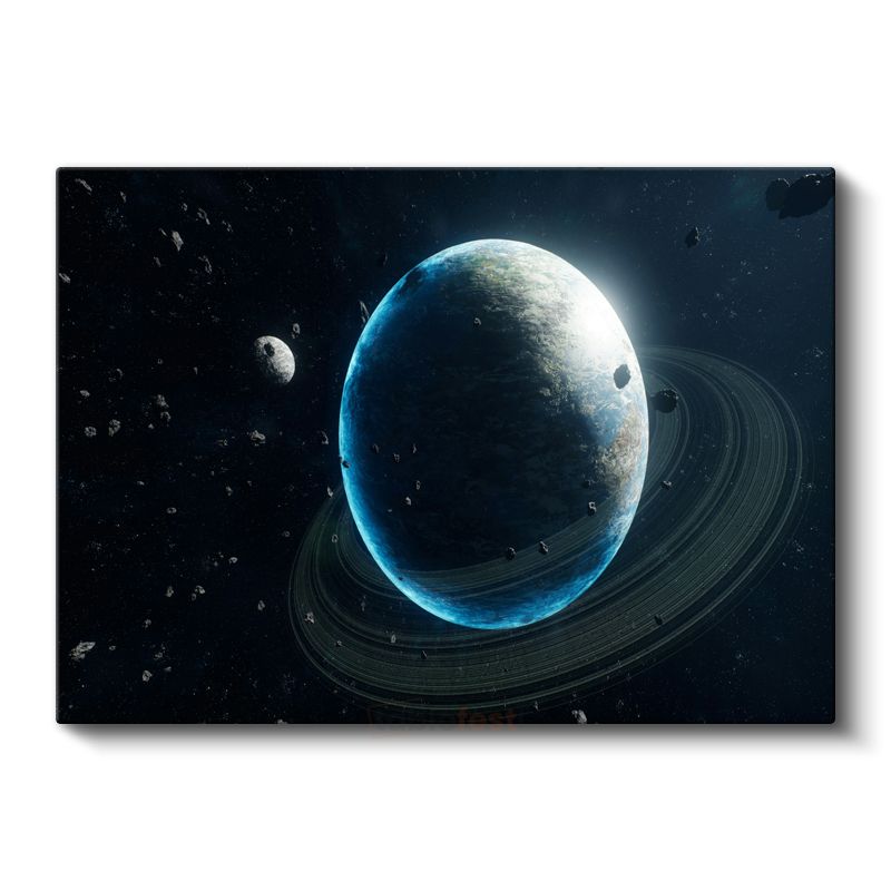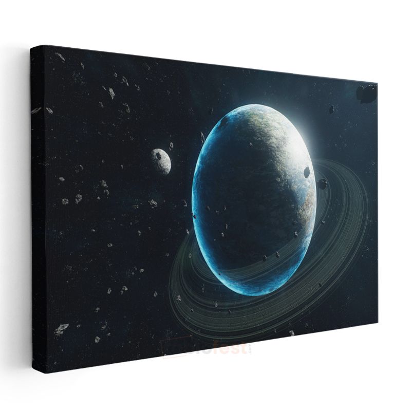 Mavi Gezegen - Işıltılı Halkaları ile Uzay Manzarası Kanvas Tablo