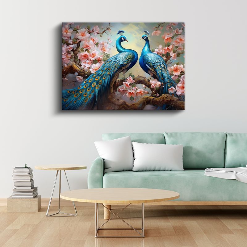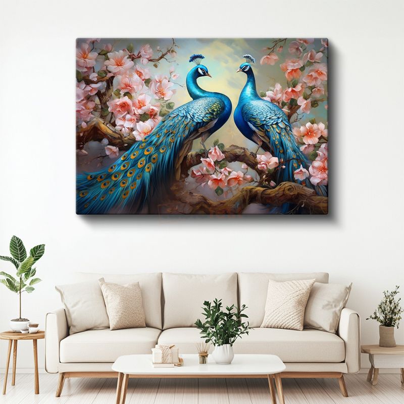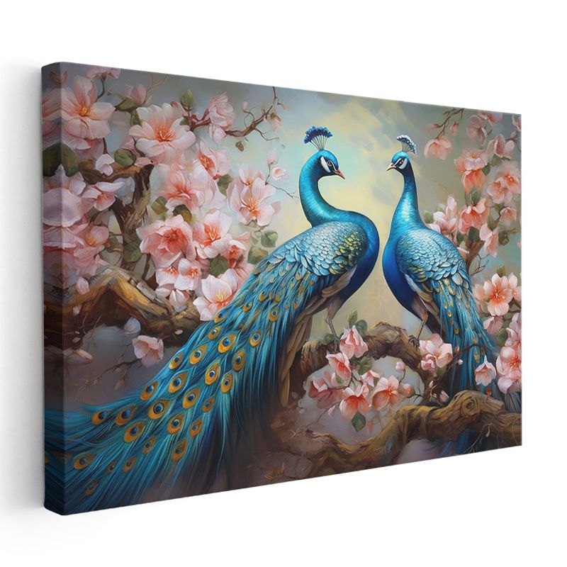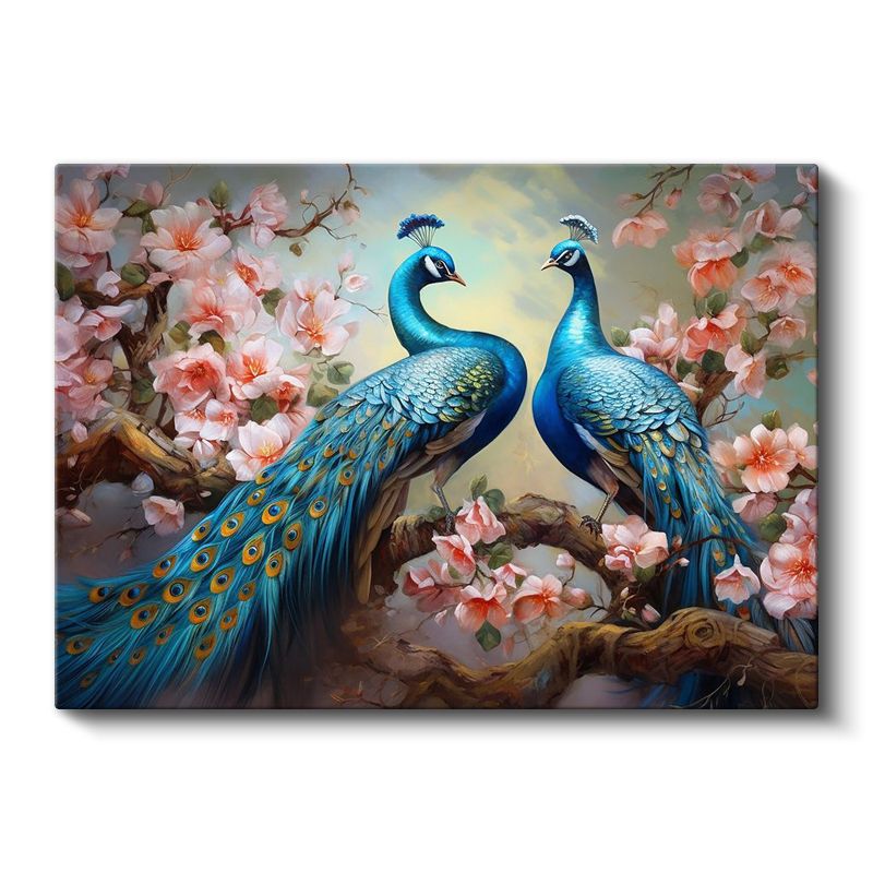 Mavi İhtişam - Çiçekli Dallarda Tavus Kuşu Çifti Kanvas Tablo